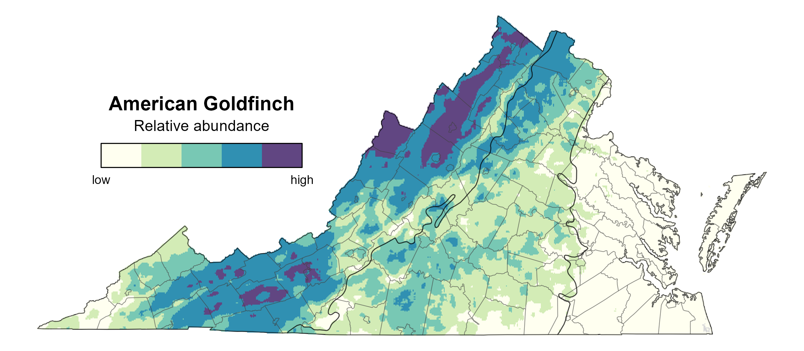 American Goldfinch relative abundance was estimated to be uniformly high across the state except in marginal habitats within the Coastal Plain region (Figure 5).