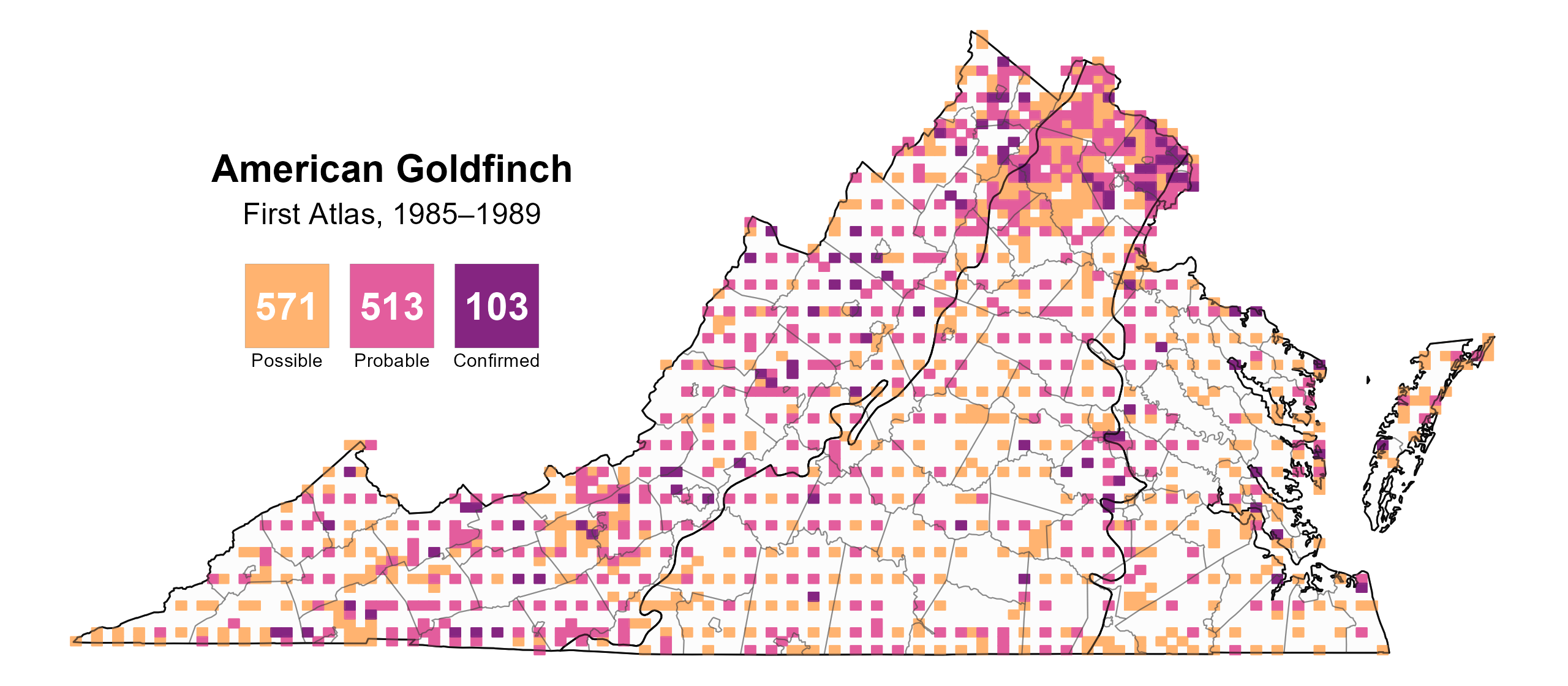 Figure 3: American Goldfinch breeding observations from the First Atlas (1985–1989). The colored boxes illustrate Atlas blocks (approximately 10 mi2 [26 km2] survey units) where the species was detected. The colors show the highest breeding category recorded in a block. The numbers within the colors in the legend correspond to the number of blocks with that breeding evidence category.