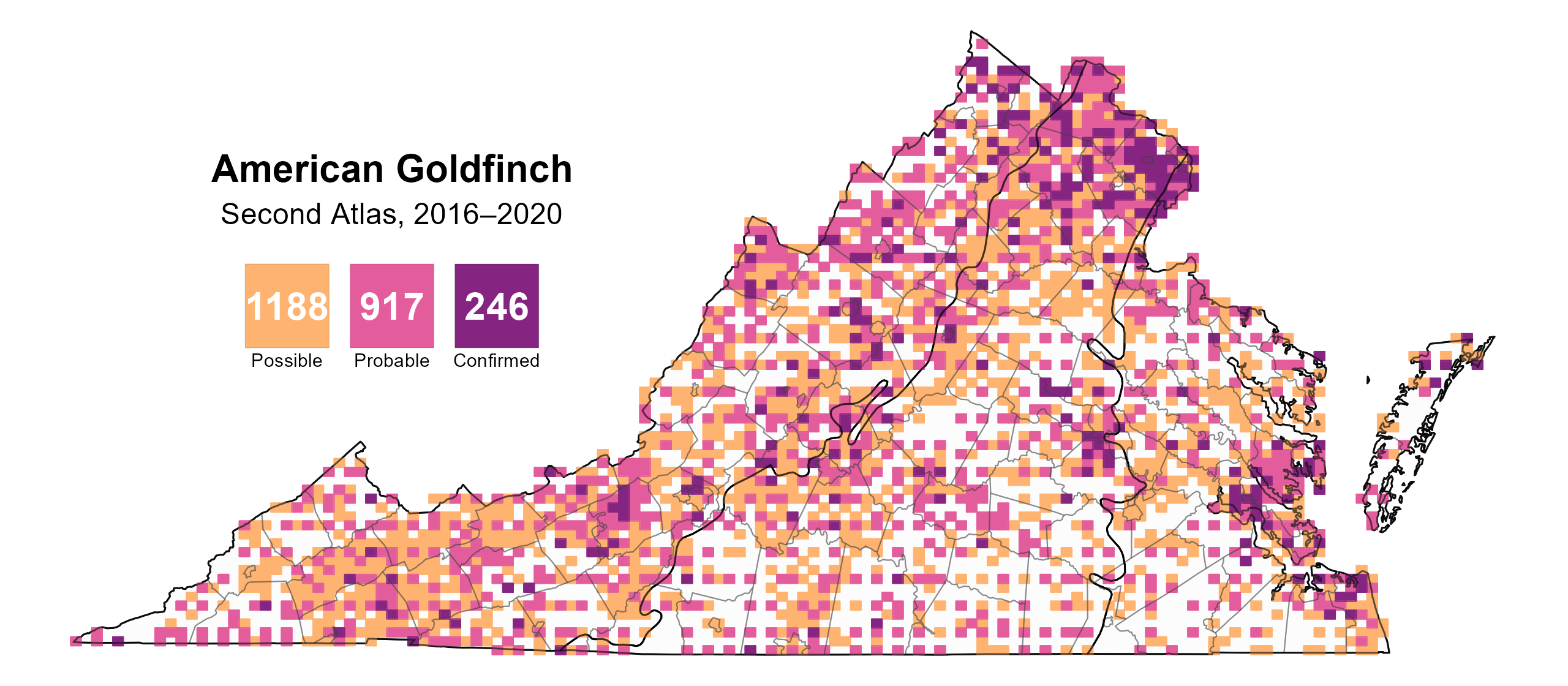 Figure 2: American Goldfinch breeding observations from the Second Atlas (2016–2020). The colored boxes illustrate Atlas blocks (approximately 10 mi2 [26 km2] survey units) where the species was detected. The colors show the highest breeding category recorded in a block. The numbers within the colors in the legend correspond to the number of blocks with that breeding evidence category.