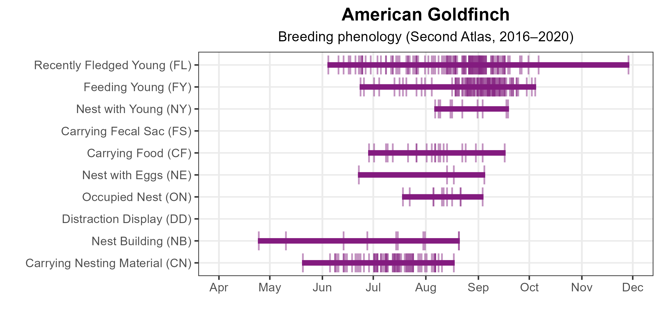 Figure 4: American Goldfinch phenology: confirmed breeding codes. This graph shows a timeline of confirmed breeding behaviors. Tick marks represent individual observations of the behavior.