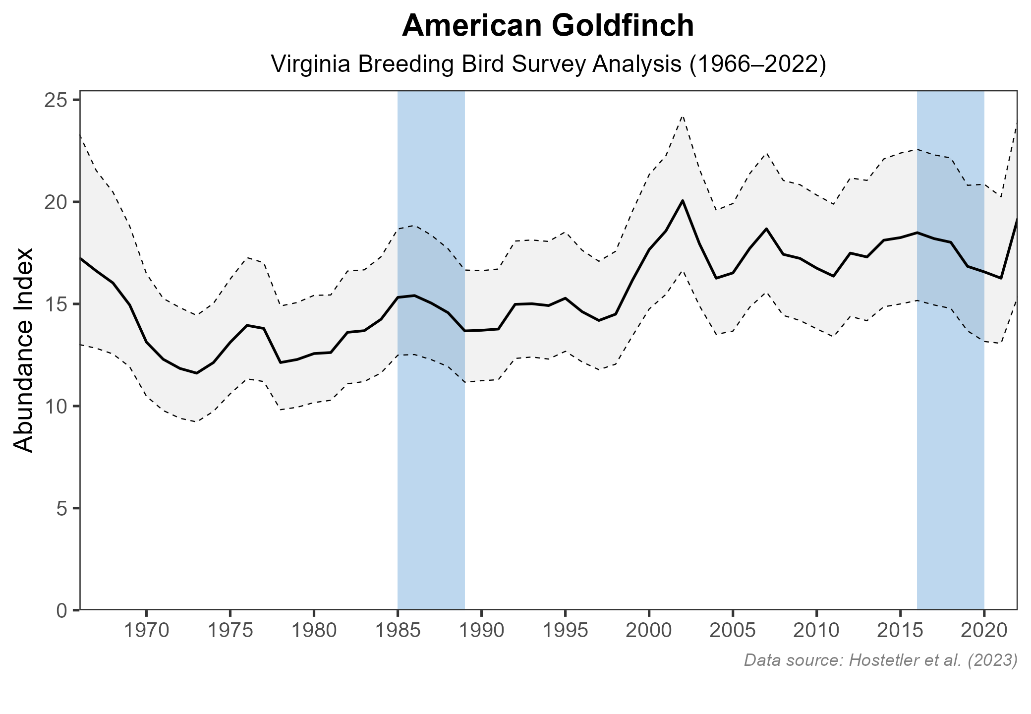 The total estimated American Goldfinch population in the state is approximately 2,212,000 individuals (with a range between 1,099,000 and 4,458,000). Given these population estimates, the American Goldfinch is the third most abundant bird in Virginia (among those species for which abundance could be modeled). Based on the North American Breeding Bird Survey (BBS) for Virginia, American Goldfinches were generally stable from 1961 to 2022, with a nonsignificant annual increase of 0.18% in its population. Similarly, between Atlas periods, it population increased by a nonsignificant 0.59% per year between 1988 and 2018 (Hostetler et al. 2023; Figure 6).