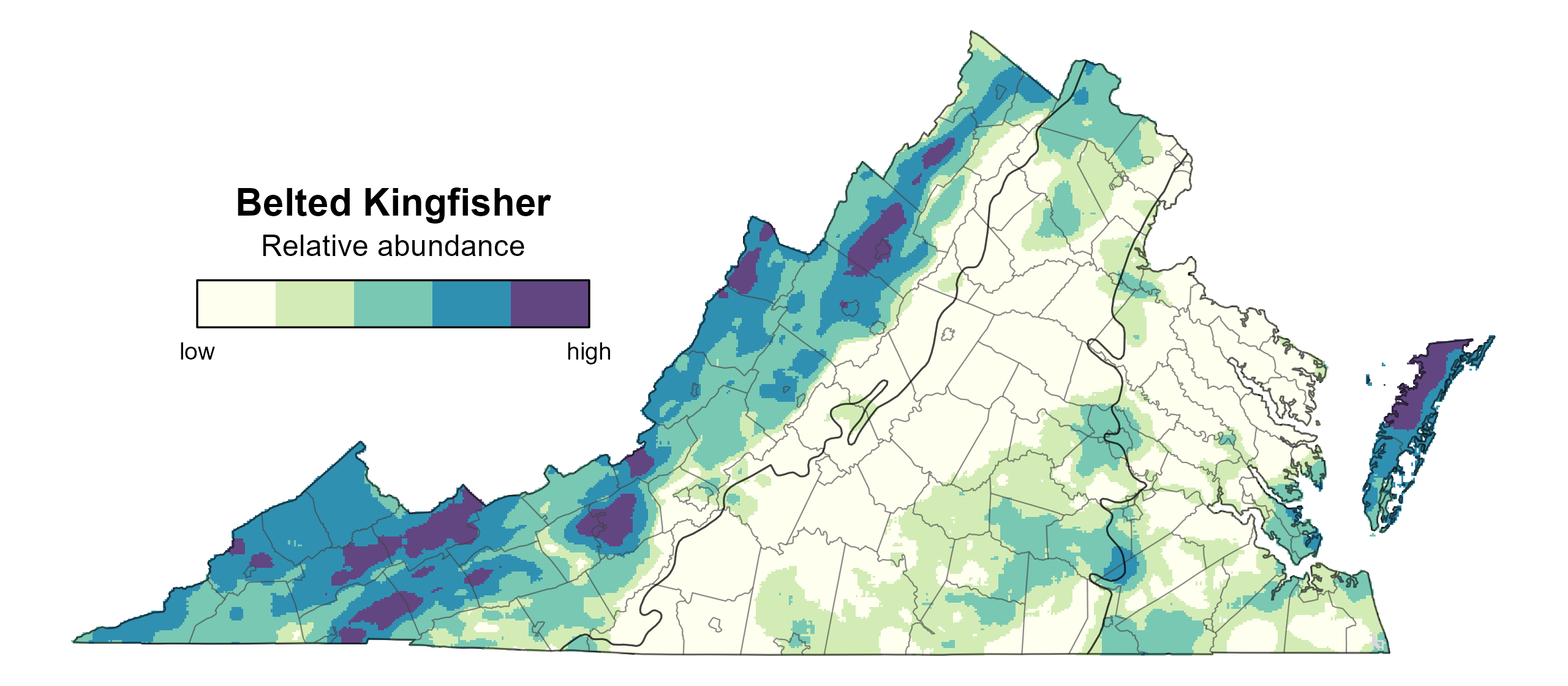Belted Kingfisher relative abundance was estimated to be highest in the Mountains and Valleys region and on the Eastern Shore (Figure 4). It was predicted to be moderately high in areas of the northern and southeastern Piedmont region and the southeastern Coastal Plain but was otherwise low in the two regions.