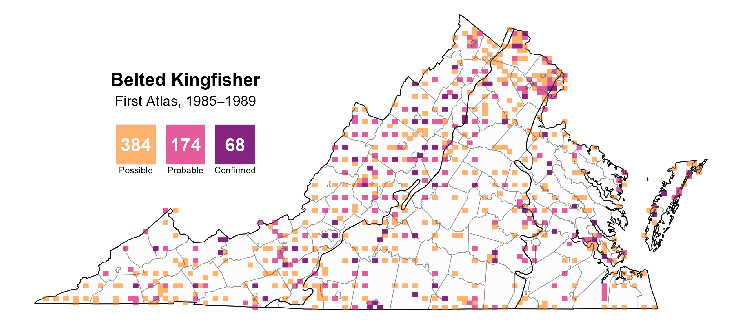 Figure 2: Belted Kingfisher breeding observations from the First Atlas (1985–1989). The colored boxes illustrate Atlas blocks (approximately 10 mi2 [26 km2] survey units) where the species was detected. The colors show the highest breeding category recorded in a block. The numbers within the colors in the legend correspond to the number of blocks with that breeding evidence category.