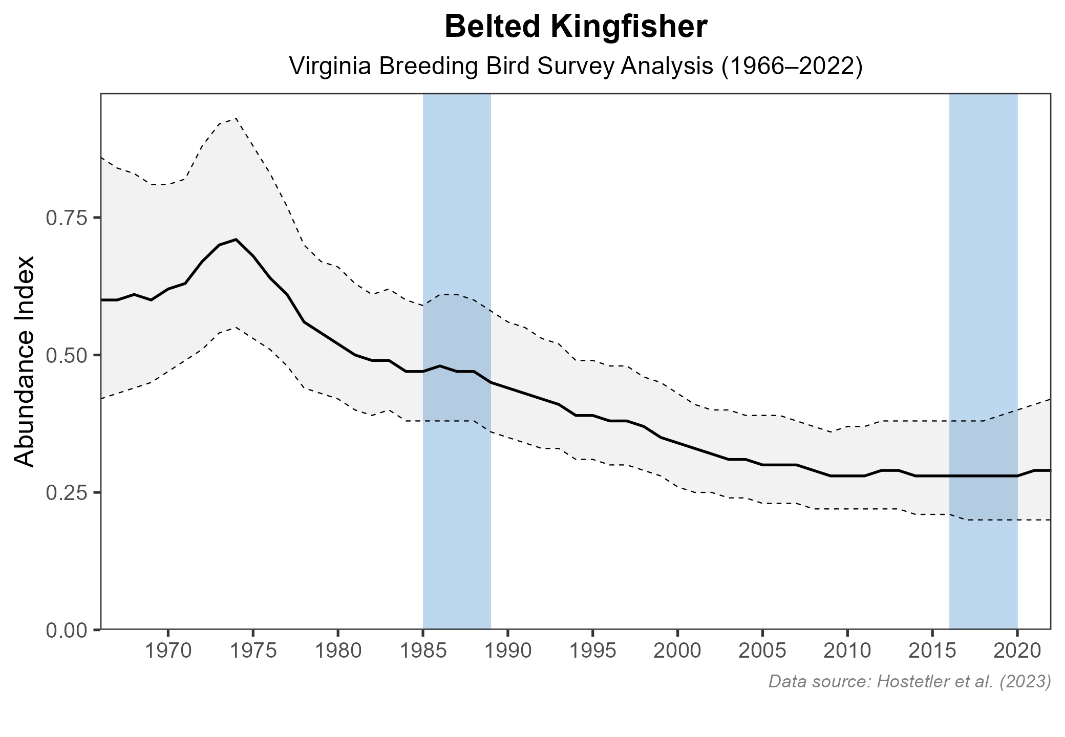 Figure 5: Belted Kingfisher population trend for Virginia as estimated by the North American Breeding Bird Survey. The vertical axis shows species abundance; the horizontal axis shows the year. The solid line indicates the estimated population trend; there is a 97.5% probability that the true population trend falls between the dashed lines. The shaded bars indicate the First and Second Atlas periods.