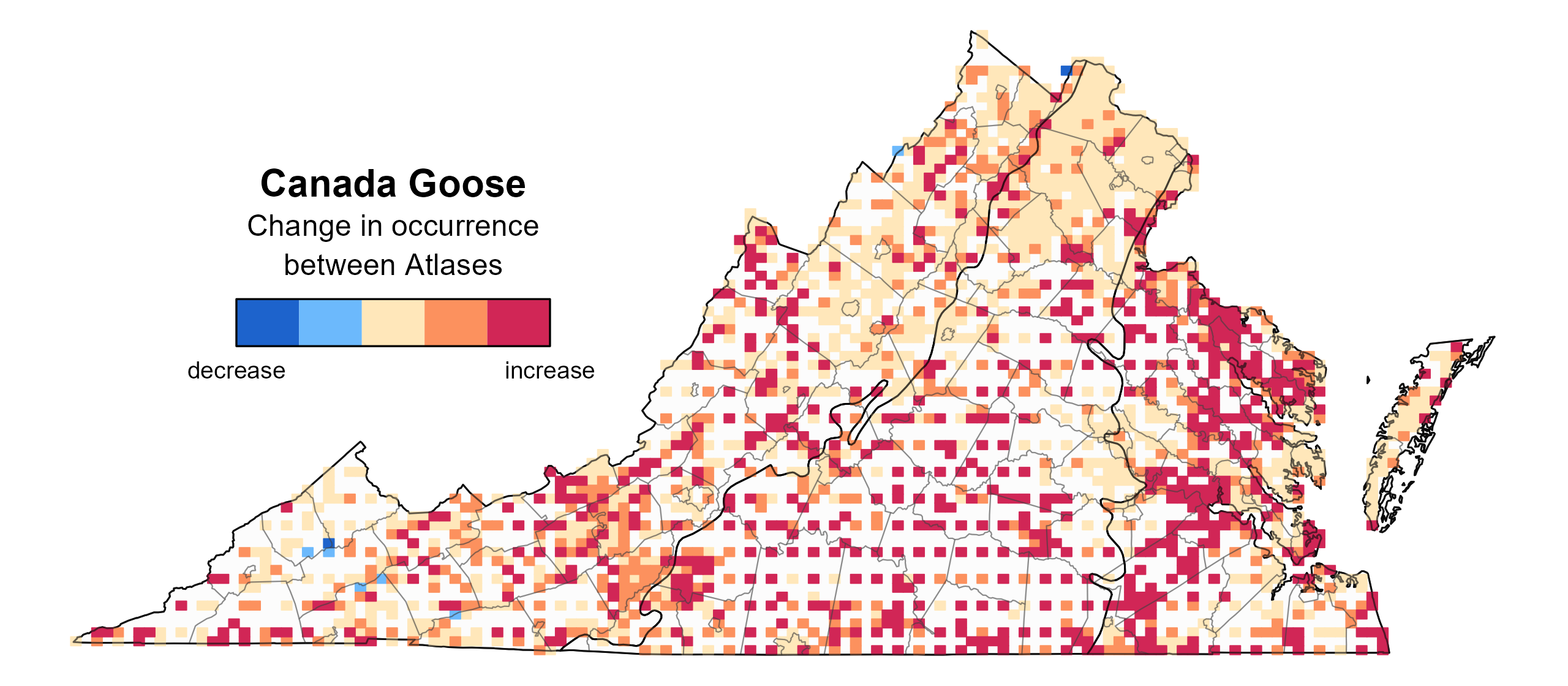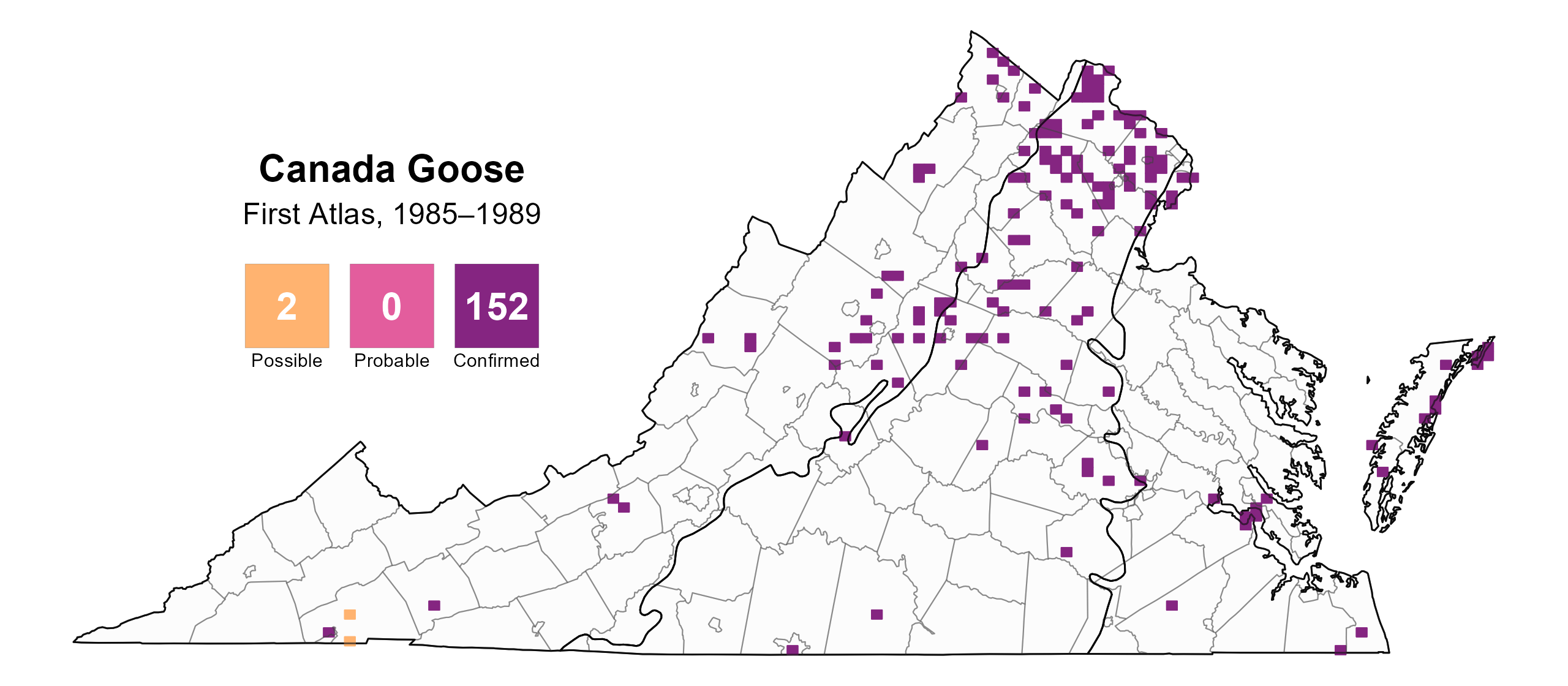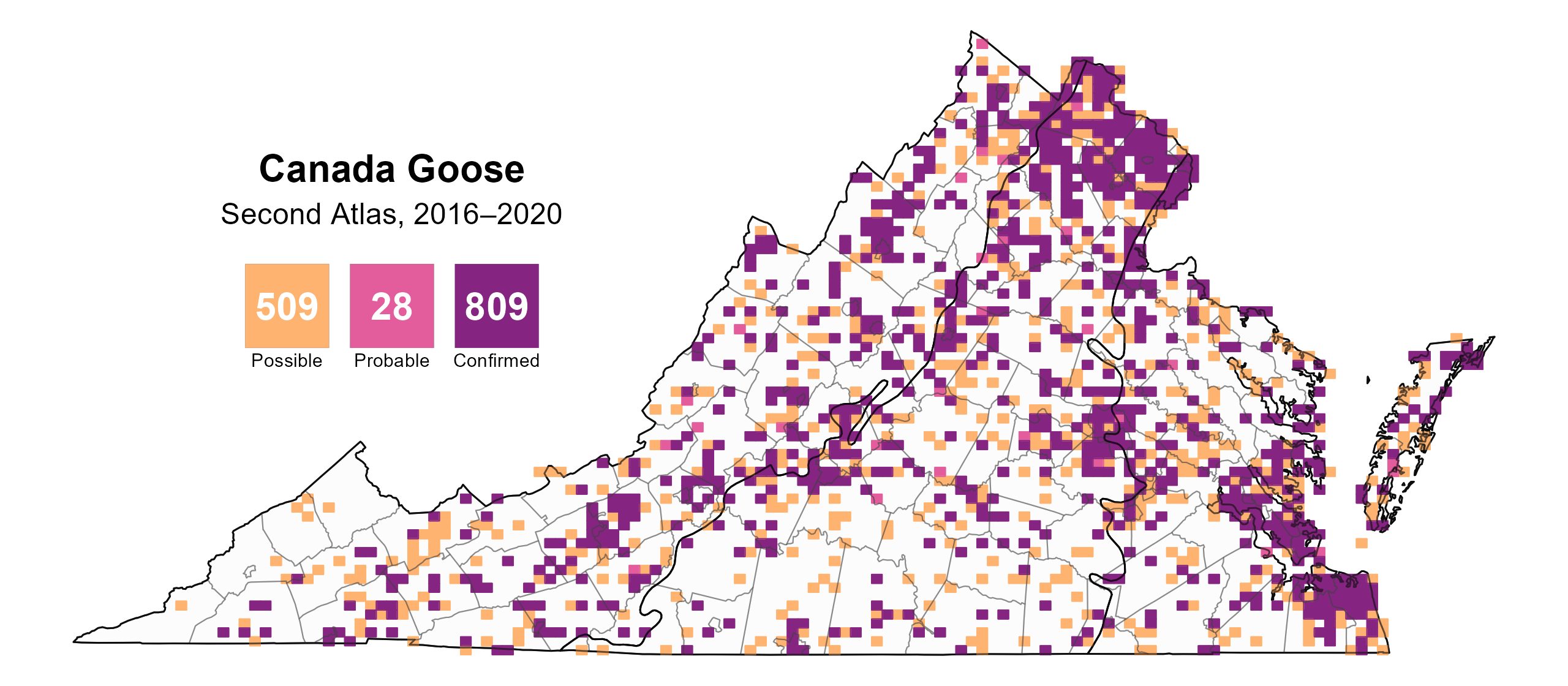 The total estimated Canada Goose population in Virginia is approximately 57,000 individuals (with a range between 27,000 and 120,000). However, the point count surveys performed for the Atlas did not provide ample coverage for this widely distributed but low breeding-density species; thus, there is a broad range around that estimate.