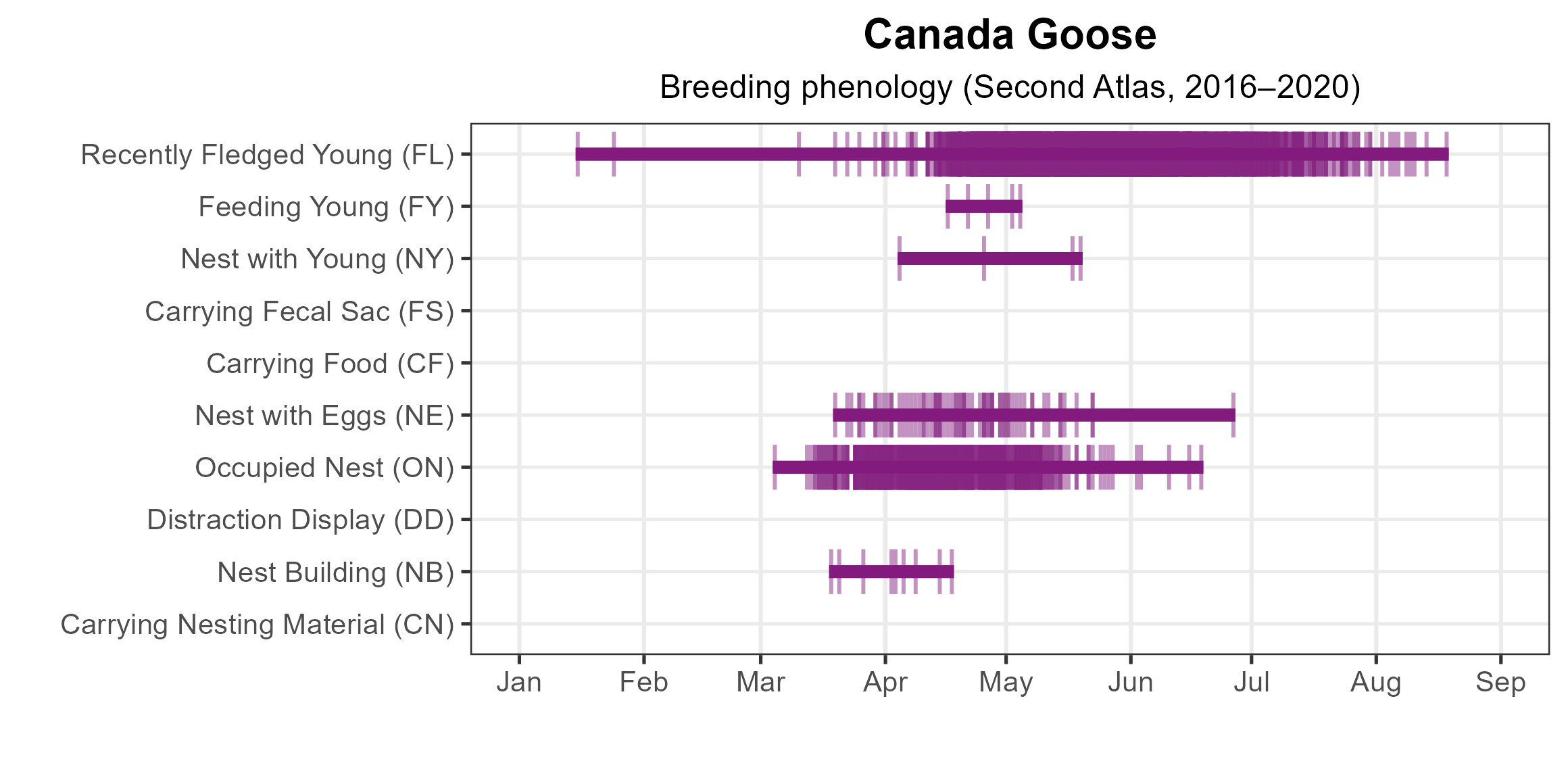 Figure 6: Canada Goose phenology: confirmed breeding codes. This graph shows a timeline of confirmed breeding behaviors. Tick marks represent individual observations of the behavior.