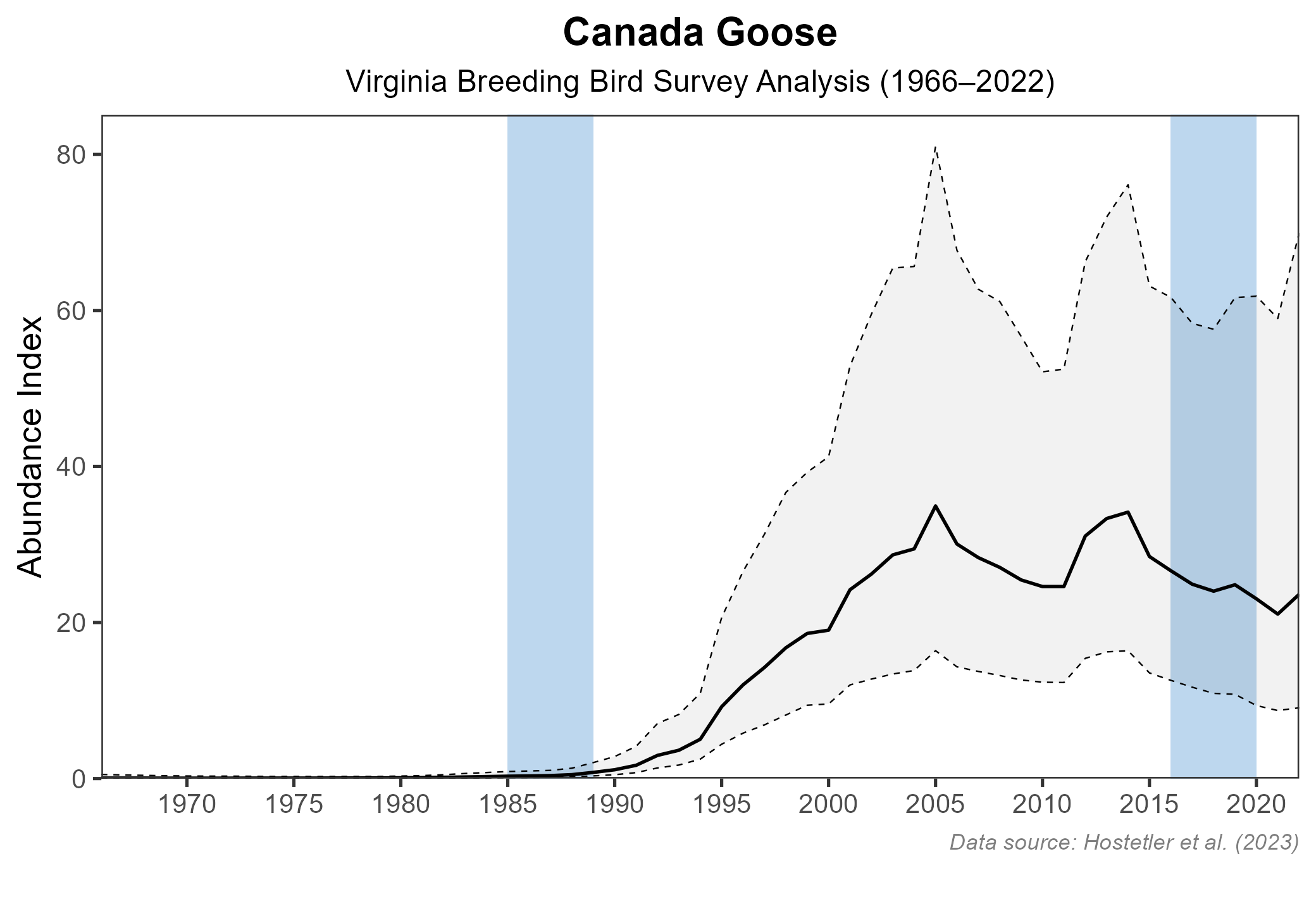 Canada Goose populations have increased significantly in Virginia. The North American Breeding Bird Survey (BBS) showed a statistically significant increase of 11.27% per year from 1966–2022 (Hostetler et al. 2023; Figure 8). Populations may have already peaked so that they are now slowly declining with more intensive management (see Conservation section). Surveys conducted by the Virginia Department of Wildlife Resources (VDWR) estimate that the population reached a peak of around 265,000 breeding pairs (+/- 25%) in the early 2000s, but it stabilized at an estimated 150,000 pairs over the last 10 years (Heusmann and Sauer 2000).