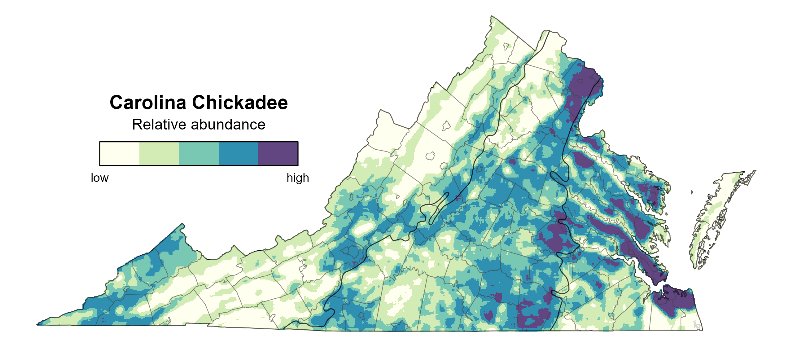 Figure 5: Carolina Chickadee relative abundance (Second Atlas, 2016–2020). This map indicates the predicted abundance of this species at a 0.4 mi2 (1 km2) scale based on environmental (including habitat) factors. Abundance values are presented on a relative scale of low to high.
