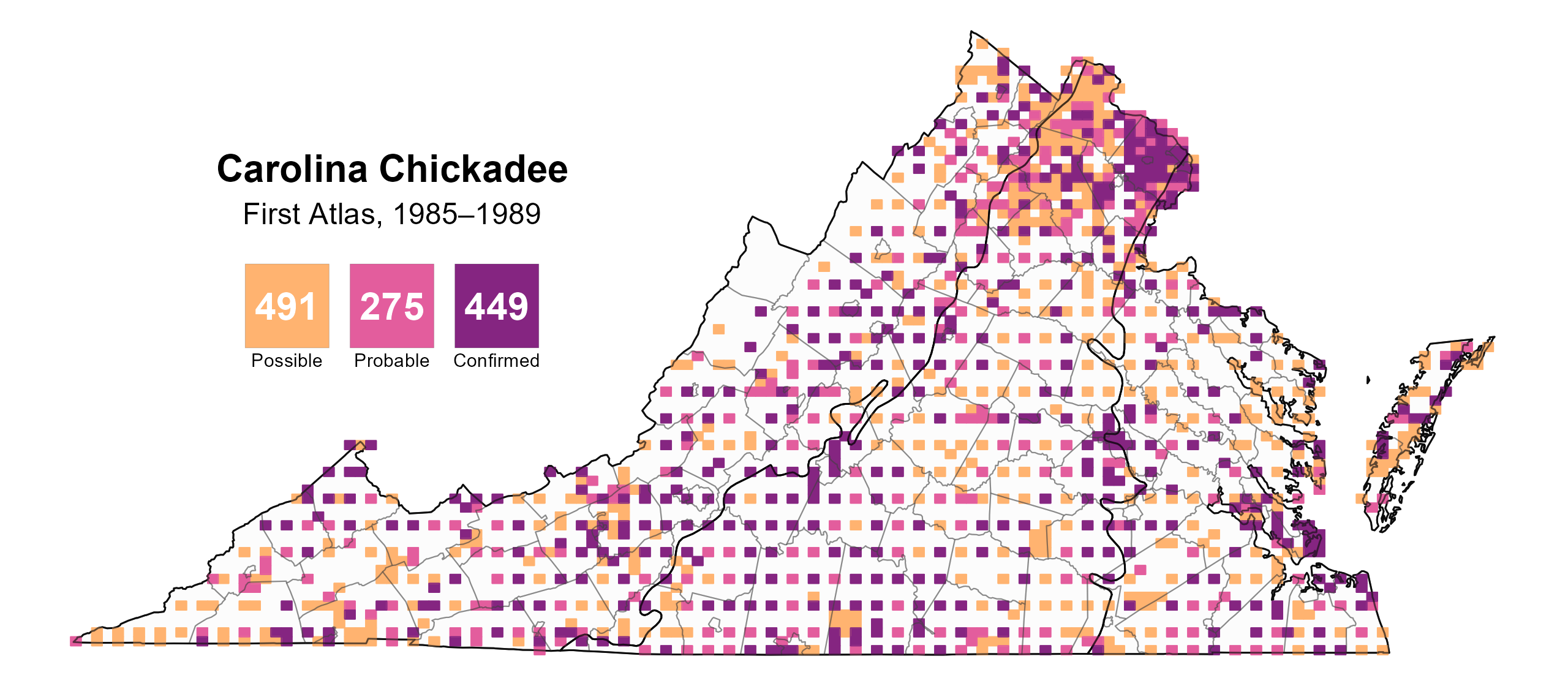 Figure 3: Carolina Chickadee breeding observations from the First Atlas (1985–1989). The colored boxes illustrate Atlas blocks (approximately 10 mi2 [26 km2] survey units) where the species was detected. The colors show the highest breeding category recorded in a block. The numbers within the colors in the legend correspond to the number of blocks with that breeding evidence category.