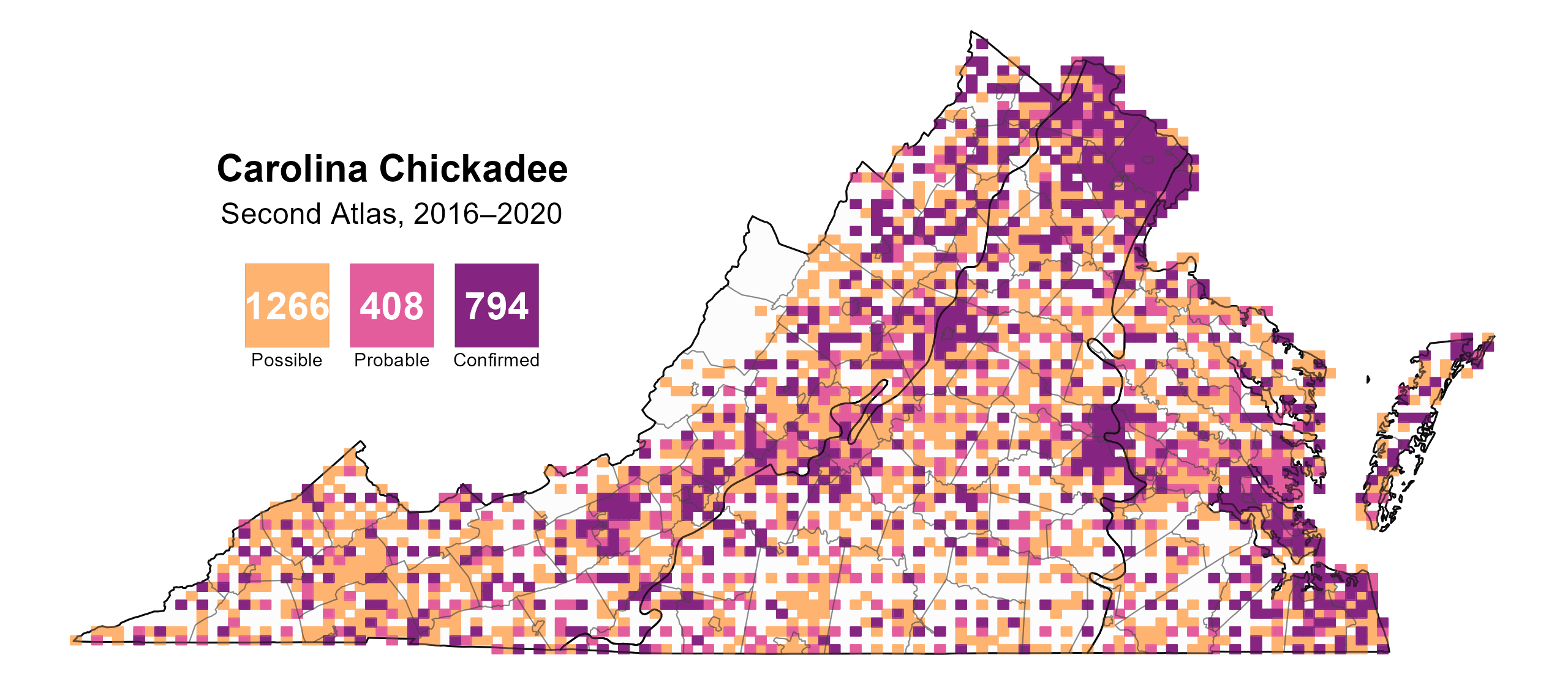 Figure 2: Carolina Chickadee breeding observations from the Second Atlas (2016–2020). The colored boxes illustrate Atlas blocks (approximately 10 mi2 [26 km2] survey units) where the species was detected. The colors show the highest breeding category recorded in a block. The numbers within the colors in the legend correspond to the number of blocks with that breeding evidence category.