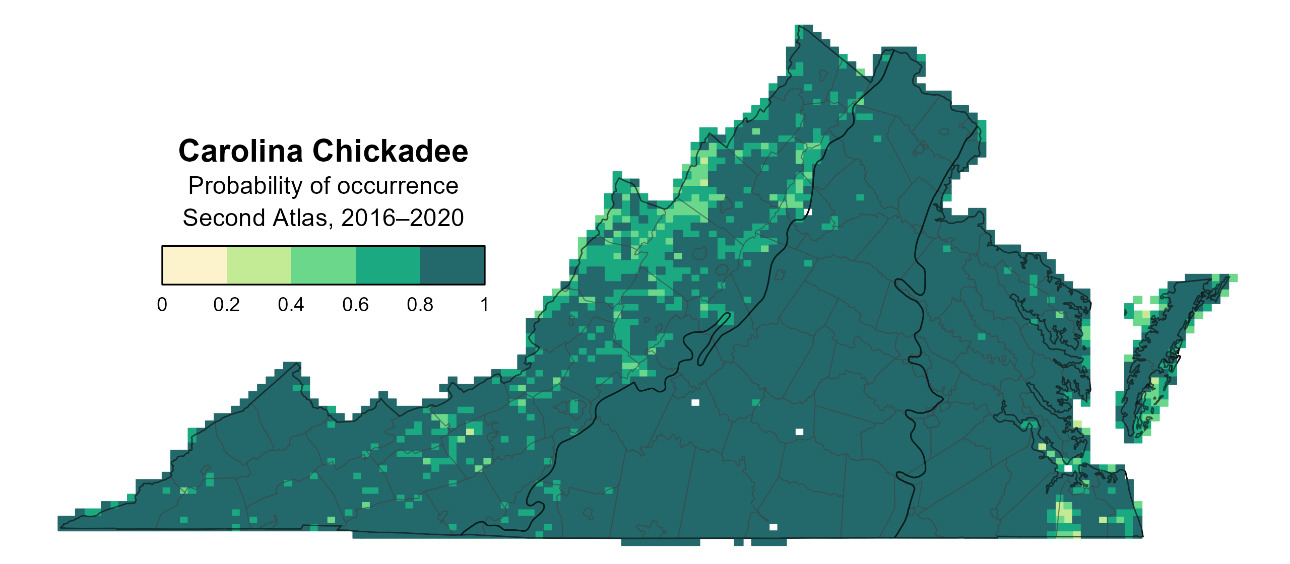 Figure 1: Carolina Chickadee breeding distribution based on probability of occurrence (Second Atlas, 2016–2020). This map indicates the probability that this species will occur in an Atlas block (an approximately 10 mi2 [26 km2] survey unit) based on environmental (including habitat) factors and after adjusting for the probability of detection (variation in survey effort among blocks).