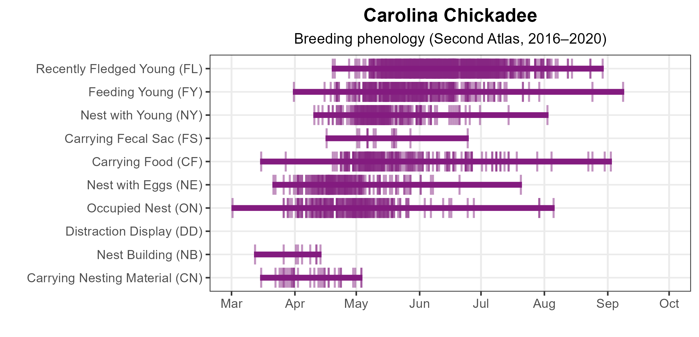 Figure 4: Carolina Chickadee phenology: confirmed breeding codes. This graph shows a timeline of confirmed breeding behaviors. Tick marks represent individual observations of the behavior.