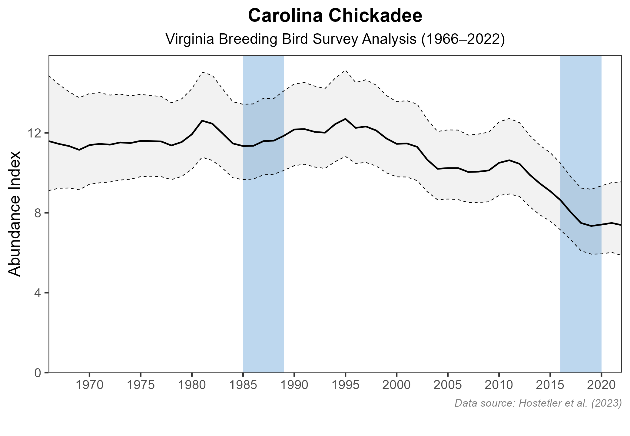 Figure 6: Carolina Chickadee population trend for Virginia as estimated by the North American Breeding Bird Survey. The vertical axis shows species abundance; the horizontal axis shows the year. The solid line indicates the estimated population trend; there is a 97.5% probability that the true population trend falls between the dashed lines. The shaded bars indicate the First and Second Atlas periods.