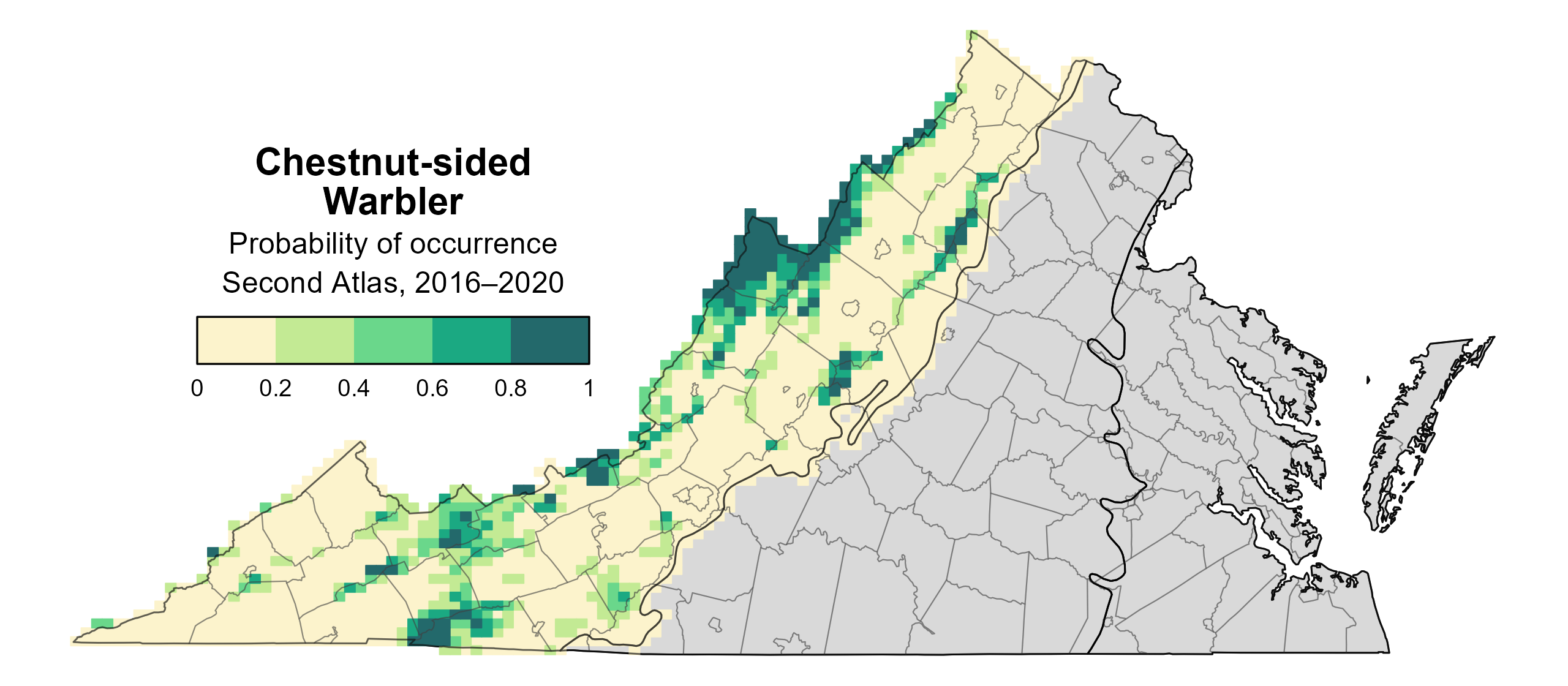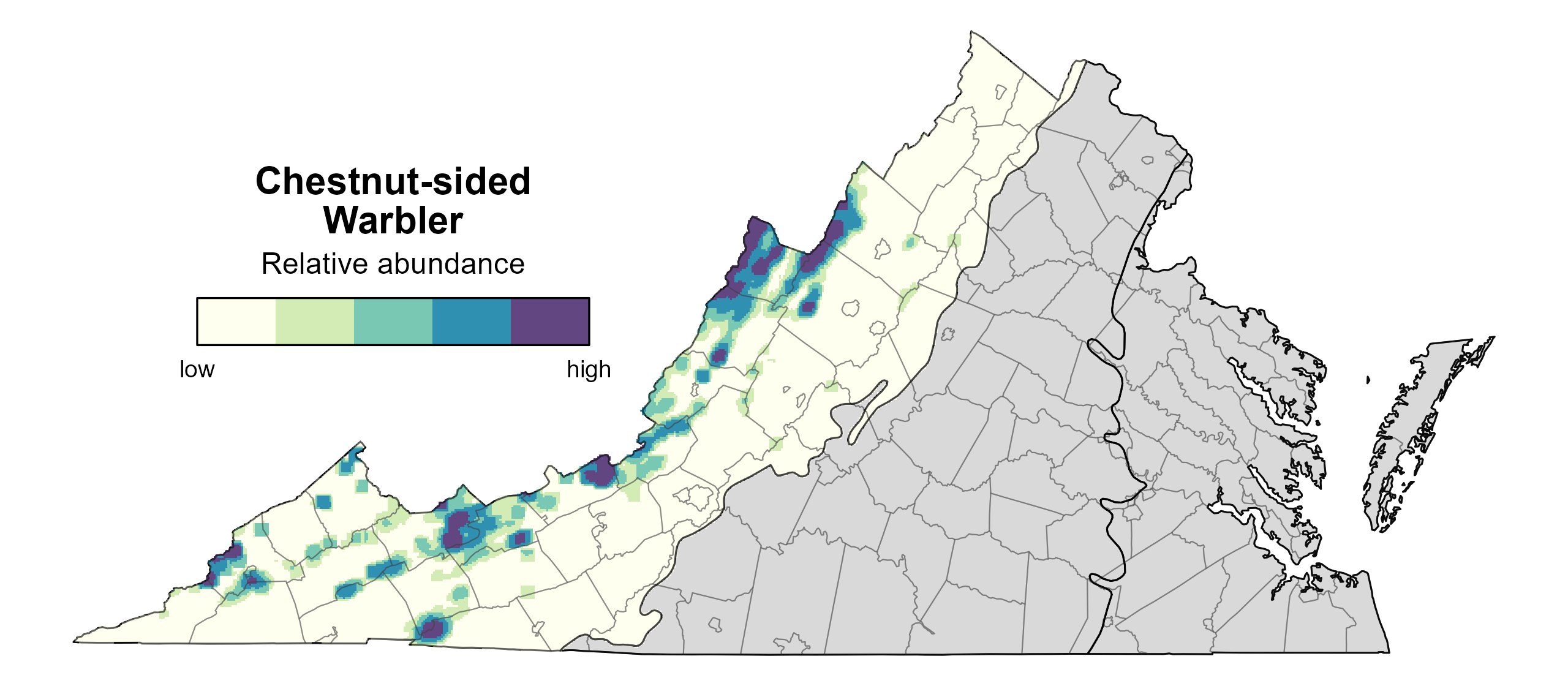 Chestnut-sided Warblers are found only in the Mountains and Valleys region. Within most of this region, this species is absent or slightly likely to occur, except for isolated areas where it is moderately to highly likely to occur in young forest habitat (Figure 1). These areas include the mountainous areas bordering West Virginia and the Blue Ridge Mountains and sections of Augusta, Bath, Giles, Grayson, Highland, Madison, Nelson, Page, Rockingham, Tazewell, and Smyth Counties.