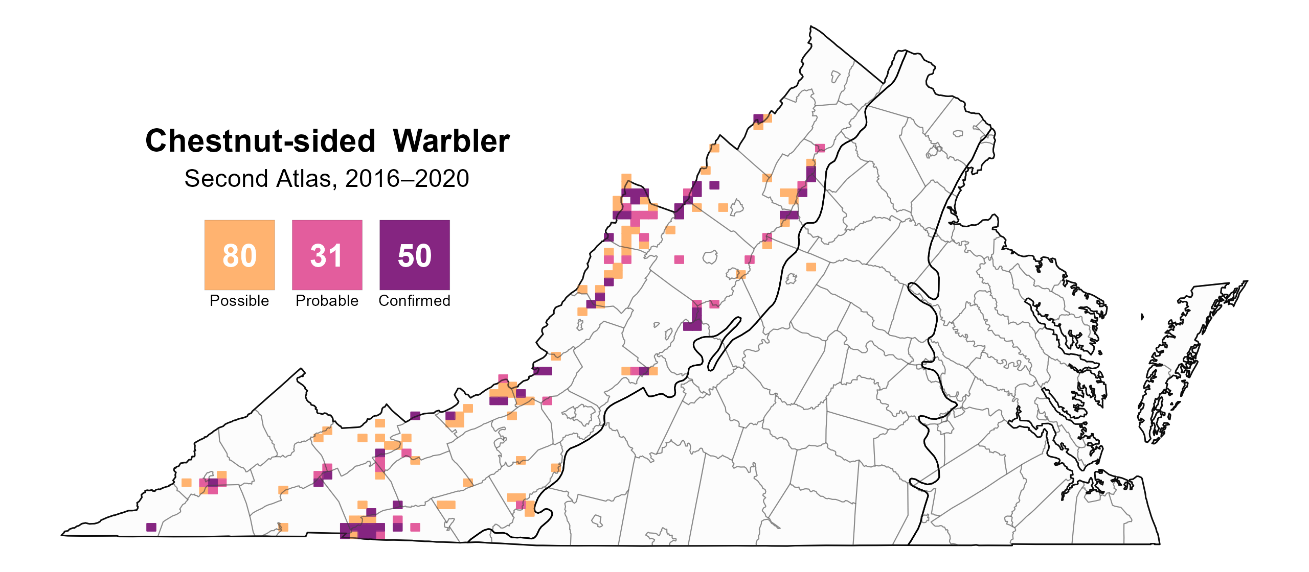With its exuberant, pleased, pleased, pleased to meetcha!, the Chestnut-sided Warbler has a distinct song. The bulk of the Chestnut-sided Warbler’s breeding range is north and west of Virginia, extending into southern Canada and the upper Great Lakes. However, there is a narrow extension of the range that follows the Appalachian Mountains south into western Virginia as well as into West Virginia, Kentucky, North Carolina, and Tennessee. Throughout their range, Chestnut-sided Warblers are considered “disturbance species,” capitalizing on the young forest conditions created by storms, timber harvests, and fires (Byers et al. 2020).