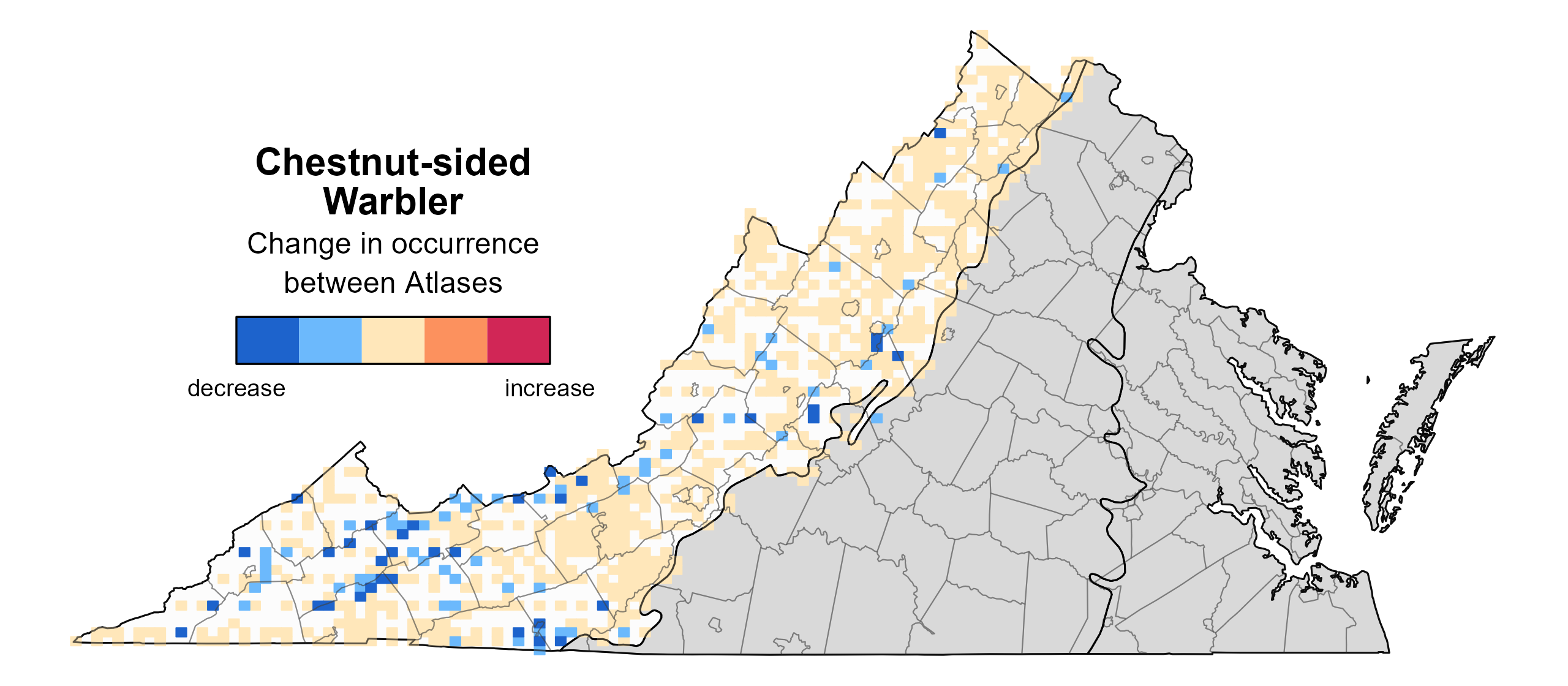 Between the First and Second Atlases (Figures 1 and 2), the Chestnut-sided Warbler’s likelihood of occurrence remained generally constant throughout most of the Mountains and Valleys region but decreased in the southwestern portion of the region (Figure 3).