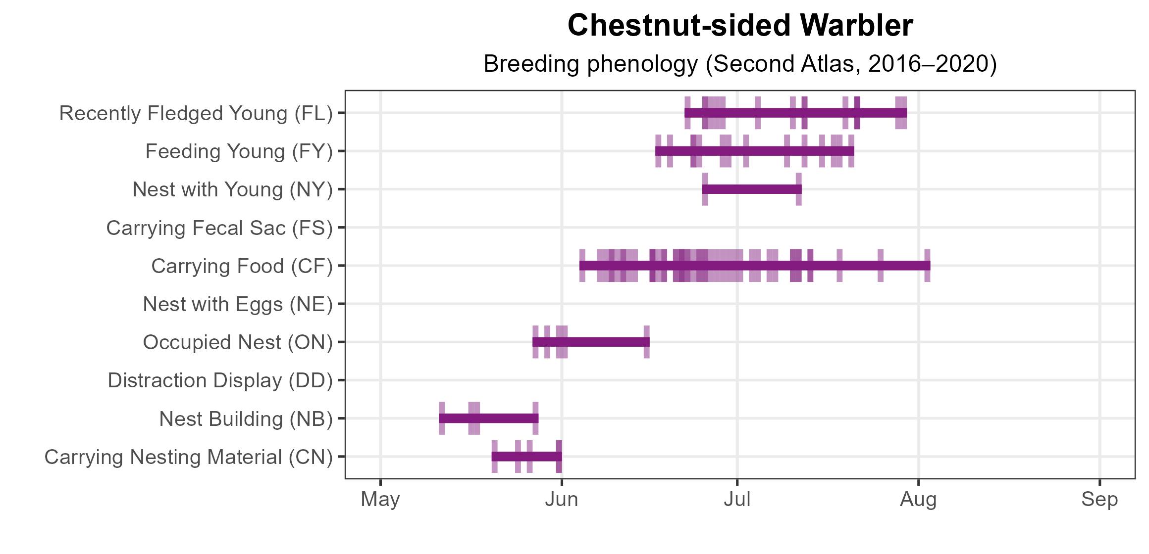 Figure 6: Chestnut-sided Warbler phenology: confirmed breeding codes. This graph shows a timeline of confirmed breeding behaviors. Tick marks represent individual observations of the behavior.