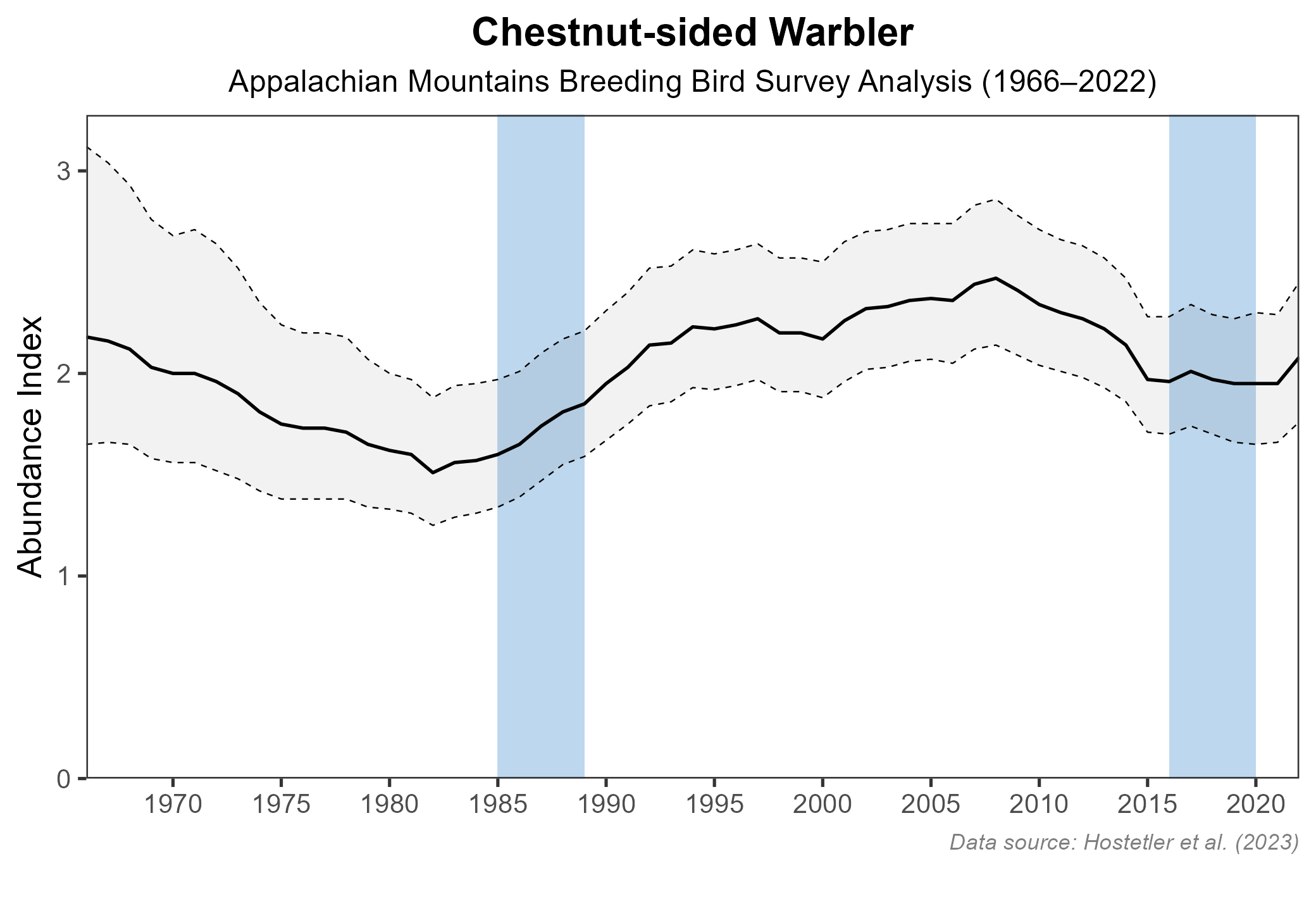 The total estimated Chestnut-sided Warbler population in the state is approximately 38,000 individuals (with a range between 15,000 and 104,000). Based on the North American Breeding Bird Survey (BBS) population trend data for the Appalachian Mountains region (as the Virginia data does not produce a credible trend for the state), the Chestnut-sided Warbler population decreased by a nonsignificant 0.08% annually from 1966–2022 in the region, and between Atlas periods, Chestnut-sided Warblers increased by a nonsignificant 0.42% per year from 1987–2018 (Hostetler et al. 2023; Figure 8).
