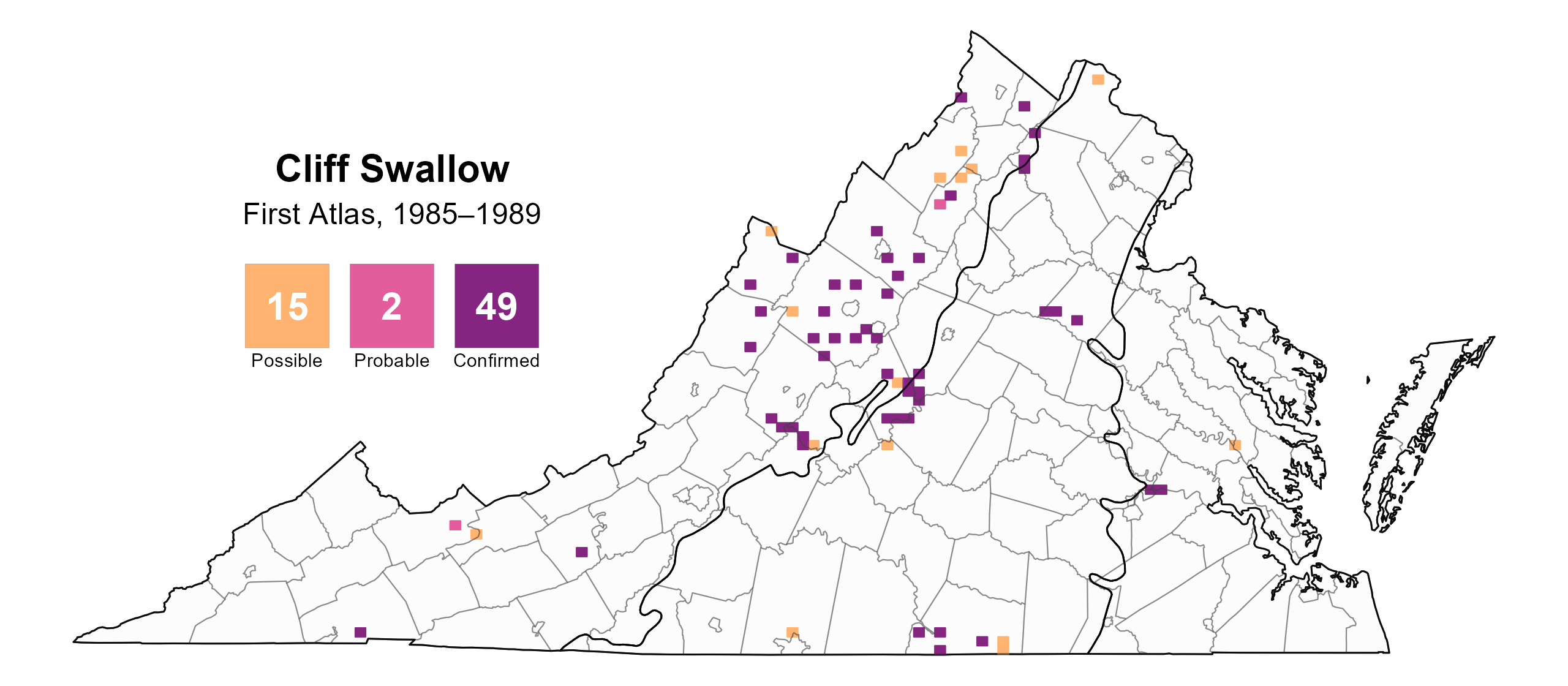 Cliff Swallows were confirmed breeders in 137 blocks and 61 counties and found to be probable breeders in three additional counties (Albemarle, Craig, and Richmond) and the city of Williamsburg (Figure 1). As expected, given the Cliff Swallow’s more westerly distribution within the state, the bulk of breeding confirmations were in the Mountains and Valleys and Piedmont regions. In some cases, colonies were discovered dotting the courses of major rivers systems, such as the Shenandoah, James, and Roanoke. During the First Atlas, fewer breeding confirmations were recorded; however, this difference may also have been due to less volunteer effort (Figure 2).