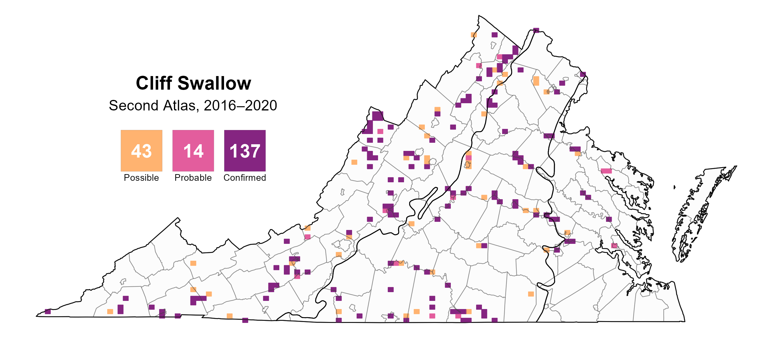 Cliff Swallows are relatively uncommon in the state and were first documented as breeding in Virginia in 1969 (Grant and Quay 1977; Brown and Brown 2020). In the Commonwealth, they breed in colonies and build their nests exclusively on artificial structures, such as bridges and buildings, while in other areas, they may also build them on cliff faces, under large tree limbs, or at the entrance of caves (Rottenborn and Brinkley 2007; Brown et al. 2020).