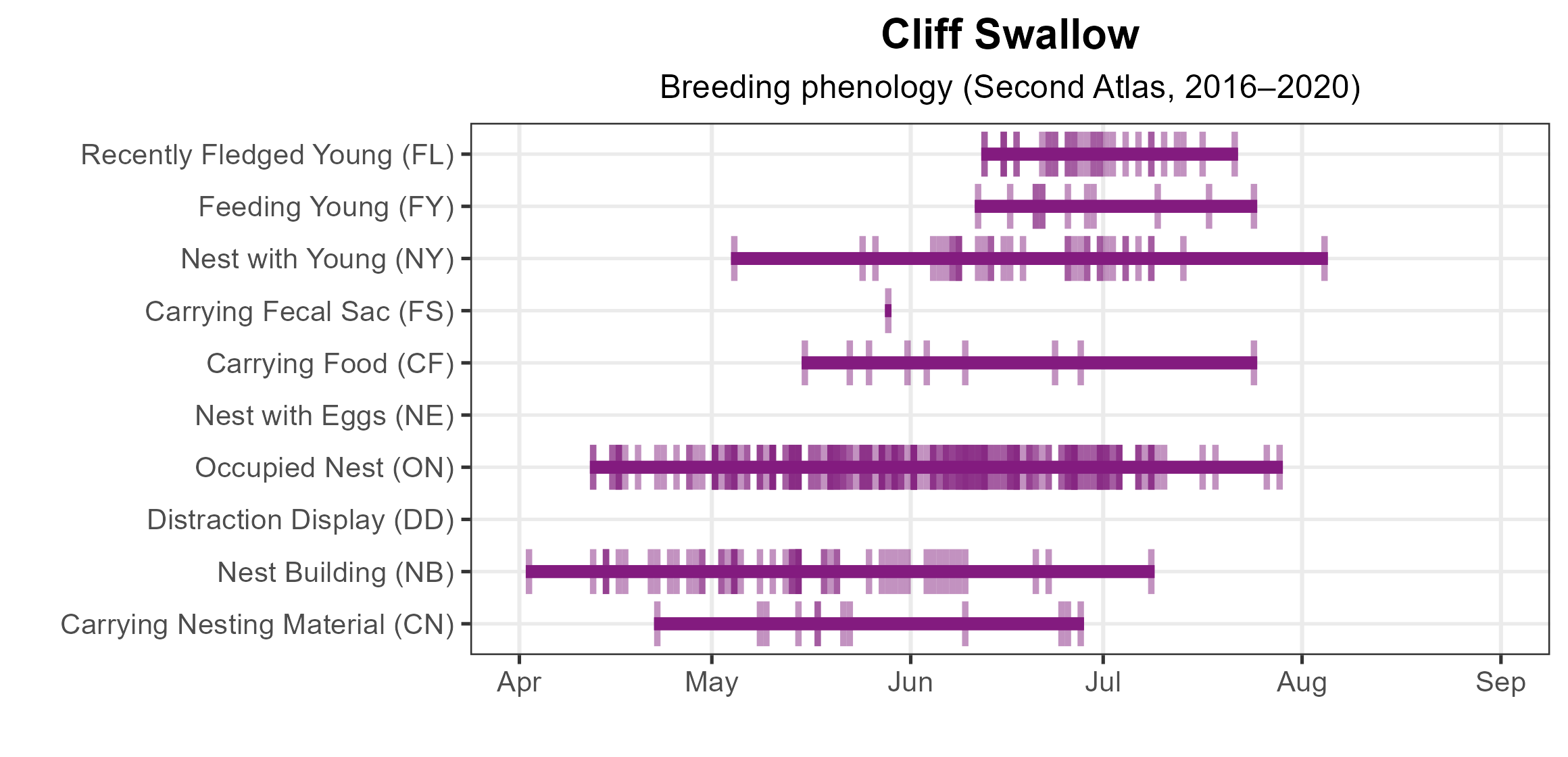 Figure 3: Cliff Swallow phenology: confirmed breeding codes. This graph shows a timeline of confirmed breeding behaviors. Tick marks represent individual observations of the behavior.