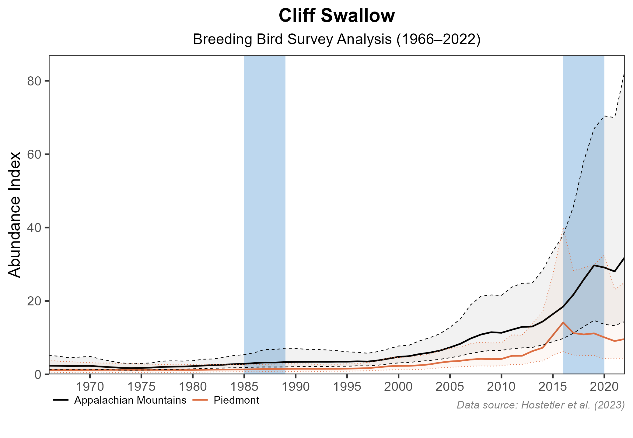 Limited detections during the point count surveys prevented the development of an abundance model for the Cliff Swallow. Additionally, the North American Breeding Bird Survey (BBS) data do not produce a credible population trend for Virginia. However, based on the Piedmont and Appalachian Region BBS population trend data, the Cliff Swallow population trend increased annually by a significant 3.78% and 4.76% in those regions, respectively, between 1961 and 2022 (Hostetler et al. 2023; Figure 4). Between Atlases (from 1987 to 2018), the Piedmont region BBS data showed that its population trend experienced a significant increase of 6.78% per year, and the Appalachian BBS data showed it experienced a similar significant 6.89% increase per year.