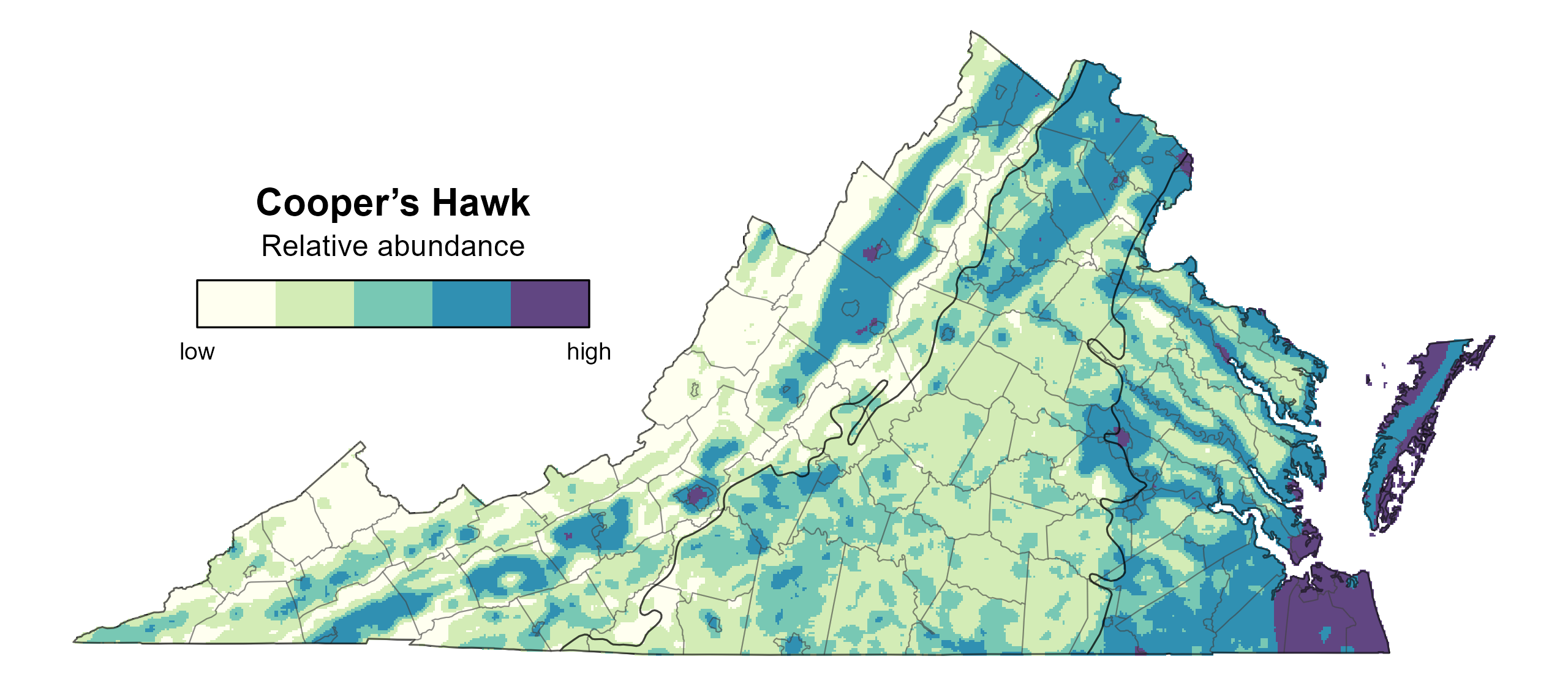 Cooper’s Hawk relative abundance was estimated to be highest in the Hampton Roads-Virginia Beach area and the Eastern Shore but also high in the same rural valleys and other urban-suburban centers that supported higher likelihood of occurrence values (Figure 7).