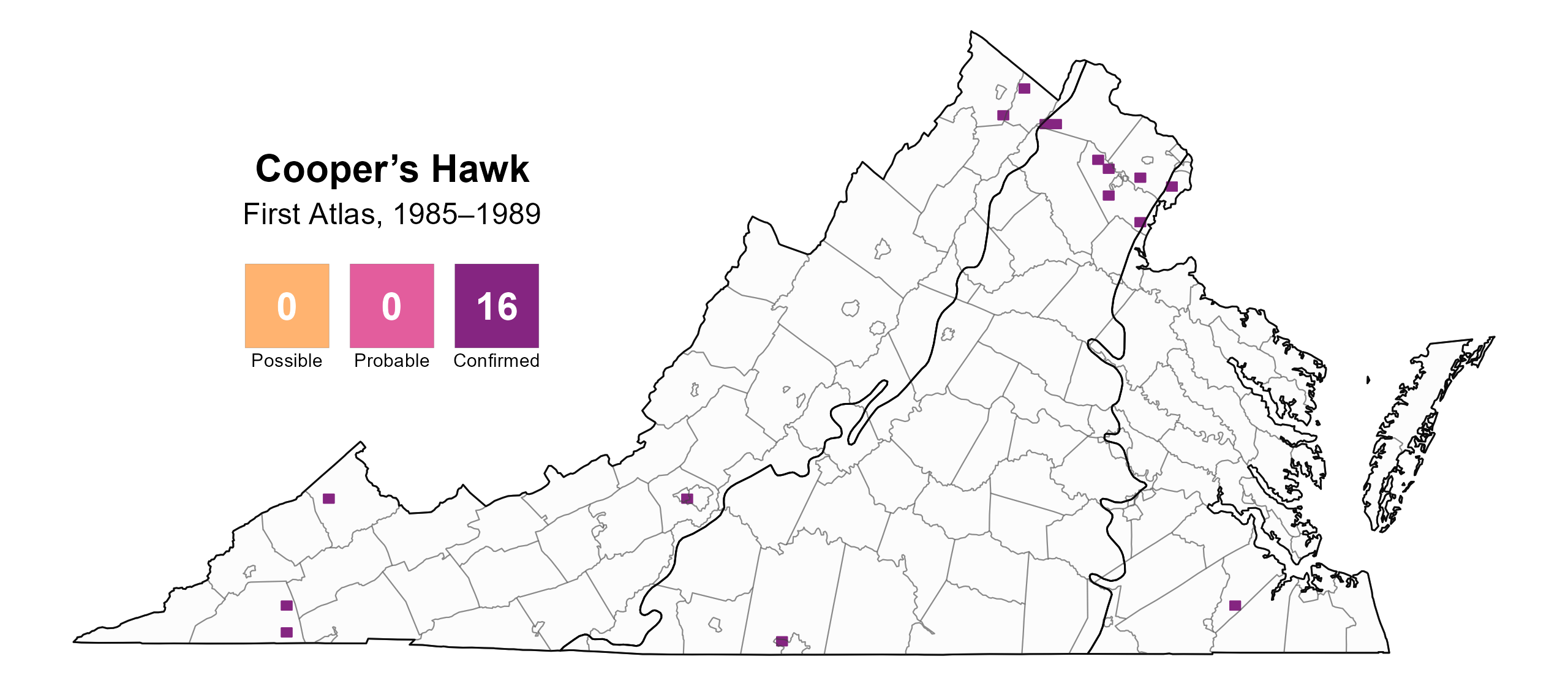 The total estimated Cooper’s Hawk population in the state is approximately 36,000 detectable individuals (with a range between 5,000 and 254,000). The North American Breeding Bird Survey (BBS) population data for Cooper’s Hawk in Virginia and regionally do not produce credible trends; thus, they are not reported here. However, although Cooper’s Hawk experienced population declines from the 1940s to early 1960s, their numbers have increased substantially (5- to 6-fold increase) since that time (Rottenborn and Brinkley 2007).