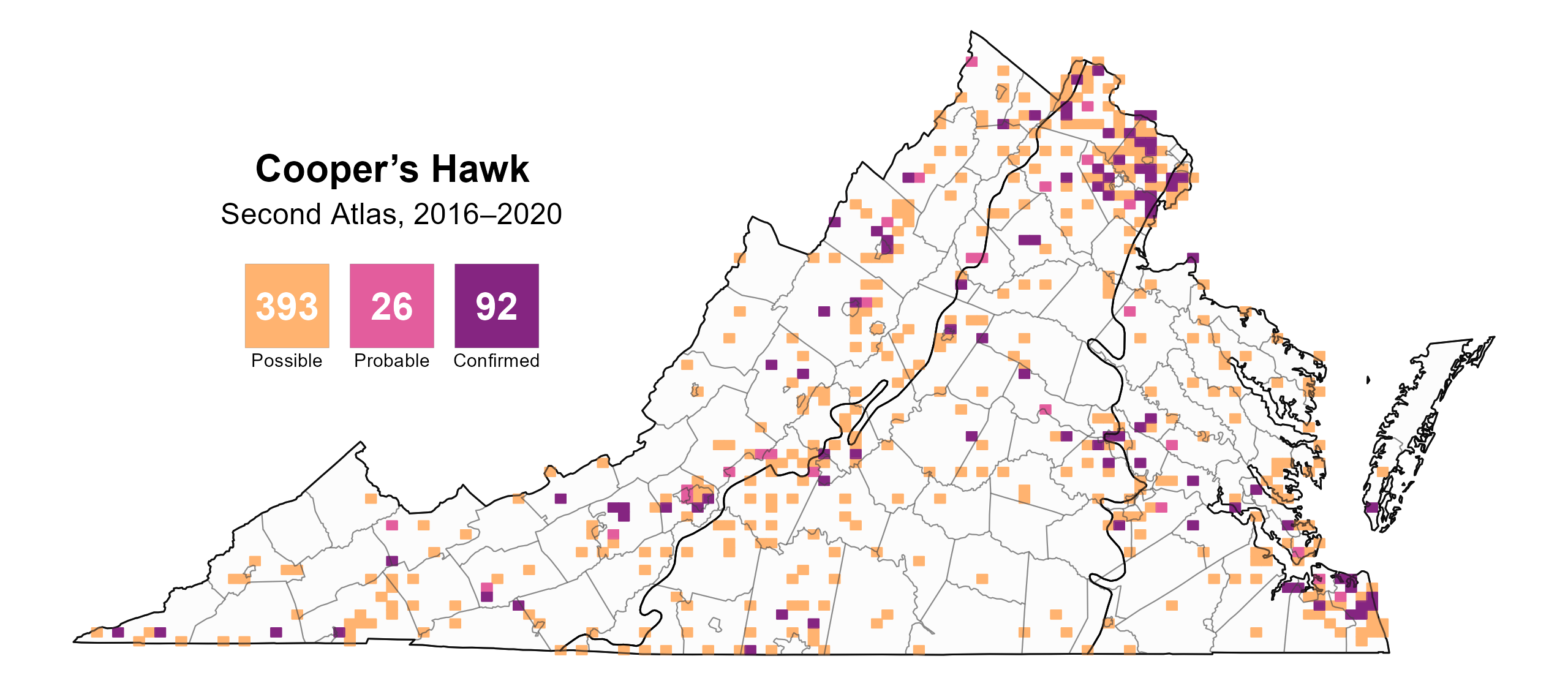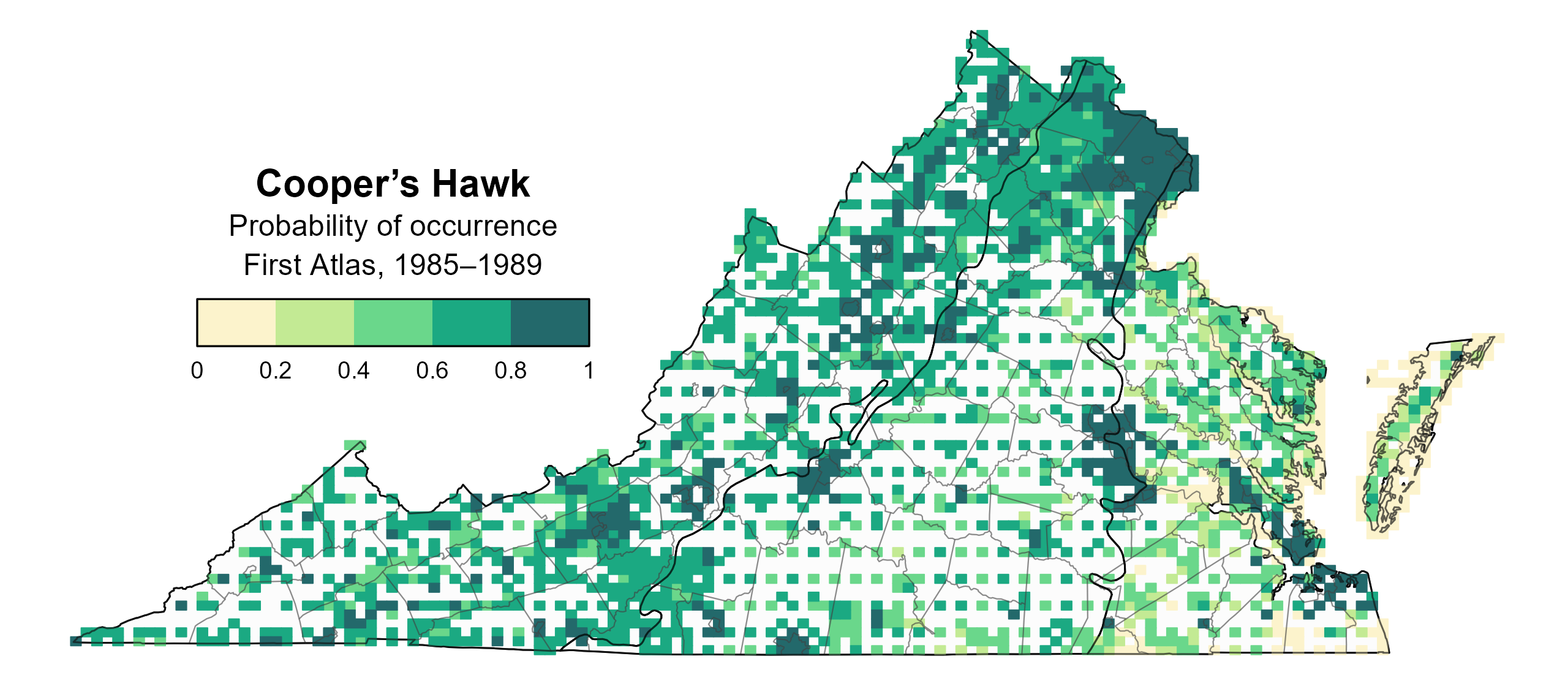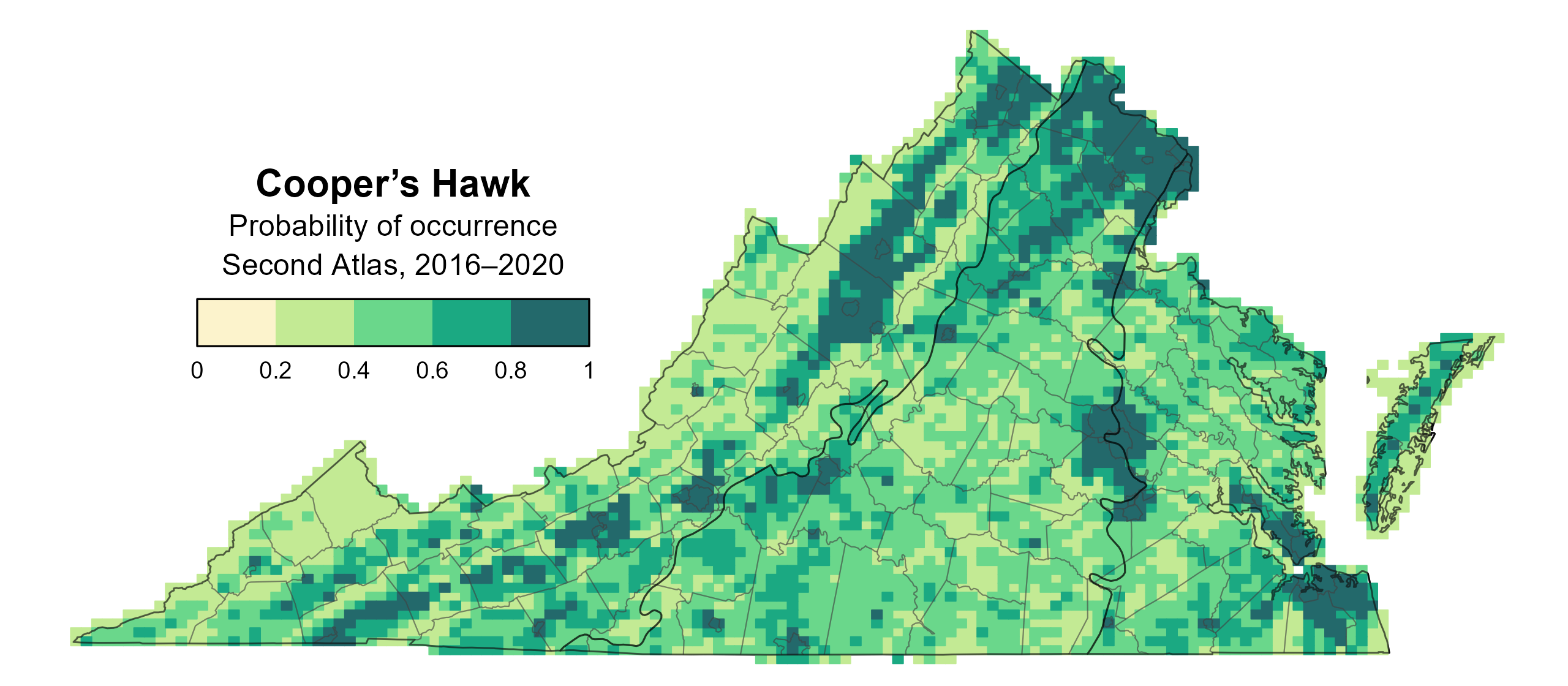 While Cooper’s Hawks occur throughout Virginia, their distribution is patchy, with the highest likelihood of occurring in valleys with both forest and farmland, such as those in Augusta, Frederick, and Rockingham Counties, and near urban-suburban areas, such as Richmond, Norfolk, and Northern Virginia (Figure 1). This pattern of habitat use (agricultural and developed lands) is consistent with behavior throughout the species’ range. Once considered to be birds of the forest, Cooper’s Hawks have readily adapted to urban environments, where they capitalize on abundant populations of Rock Pigeons (Columba livia) and Mourning Doves (Zenaida macroura) (Rosenfield et al. 2020).