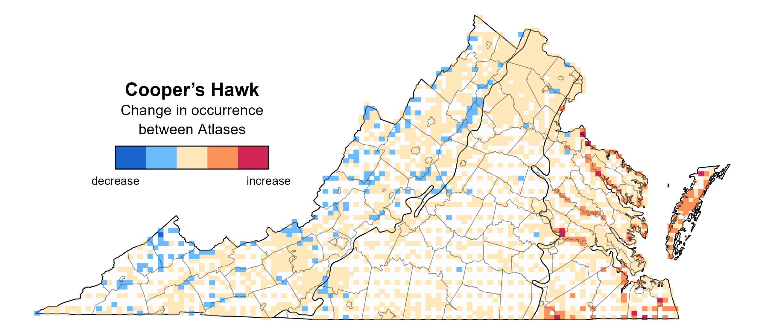 Cooper Hawk’s occurrence between the First and Second Atlases decreased across most of the Mountains and Valleys region, remained mostly constant in the Piedmont region, and increased in the Coastal Plain region along major rivers, around developed areas, and on the Eastern Shore (Figures 1 to 3). A more careful examination reveals that the change most likely represents a shift from heavily forested areas in the Mountains and Valleys region to urban and suburban and agricultural environments in the Piedmont and Coastal Plain regions.
