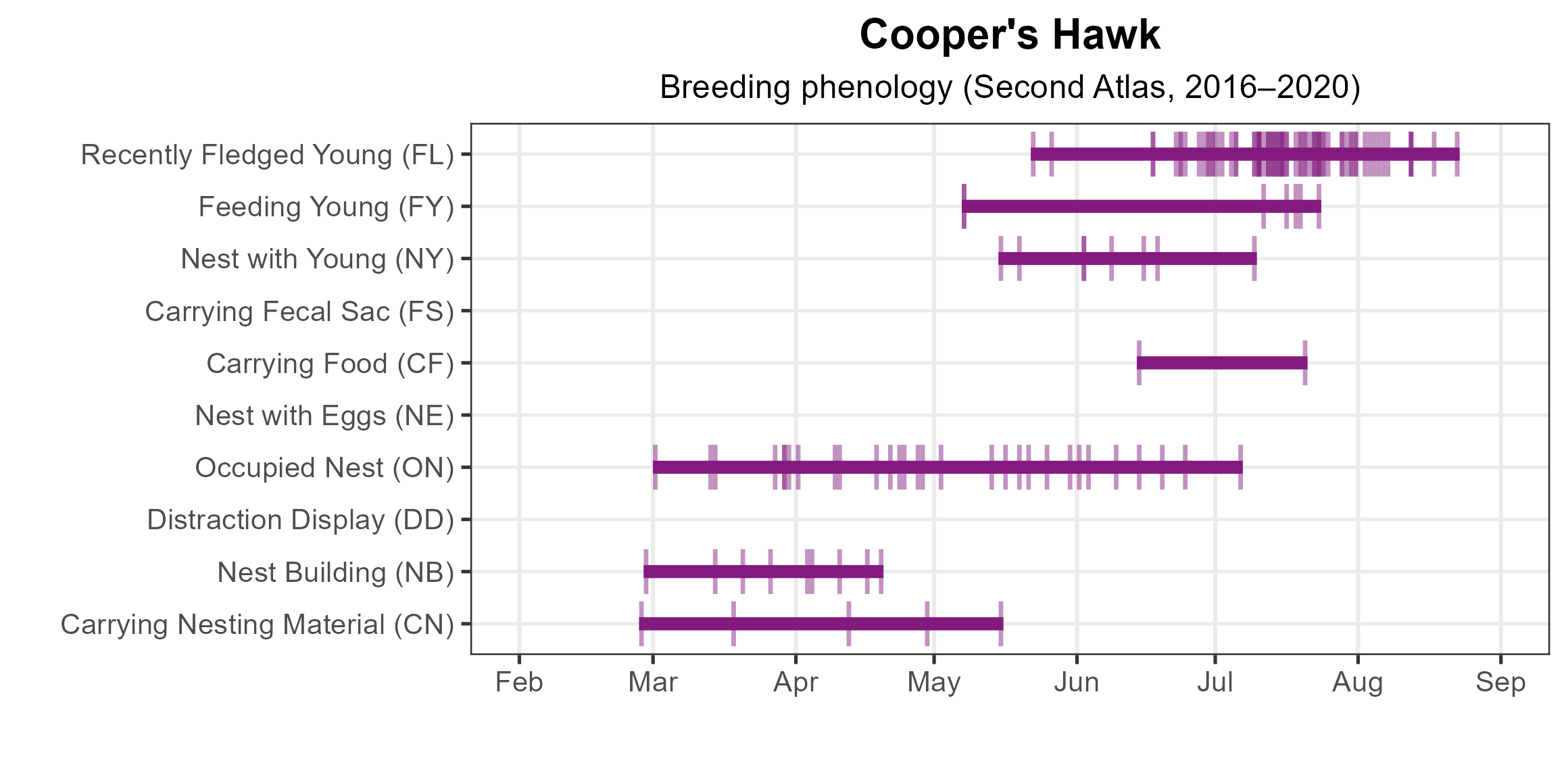 Figure 6: Cooper’s Hawk phenology: confirmed breeding codes. This graph shows a timeline of confirmed breeding behaviors. Tick marks represent individual observations of the behavior.