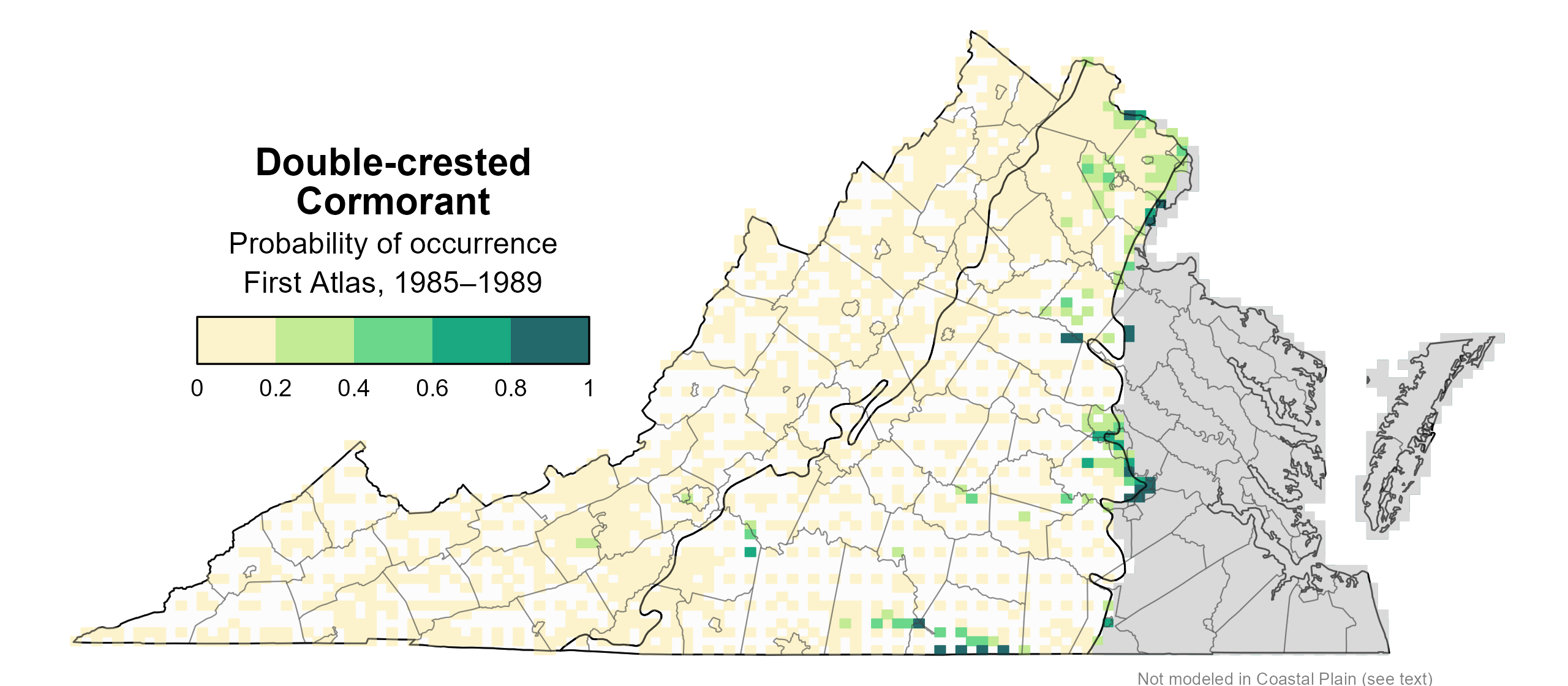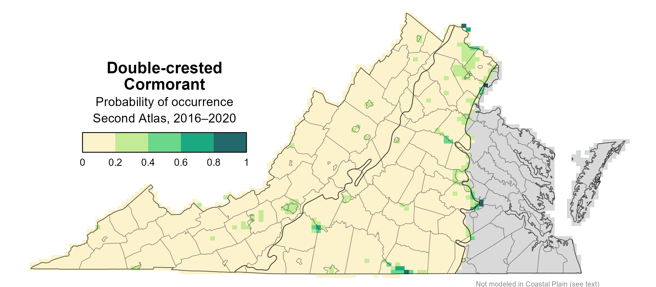 Within the Coastal Plain, the Double-crested Cormorant was well-covered during the Second Atlas by the 2018 Virginia Colonial Waterbird Survey, a coastal census conducted by the Center for Conservation Biology in collaboration with the Virginia Department of Wildlife Resources (VDWR) and The Nature Conservancy. The survey identifies nesting locations of this and other species that breed in colonies. Therefore, there was no need to model its distribution within that region. For information on where the species occurs in Virginia’s Coastal Plain, please see the Breeding Evidence section.