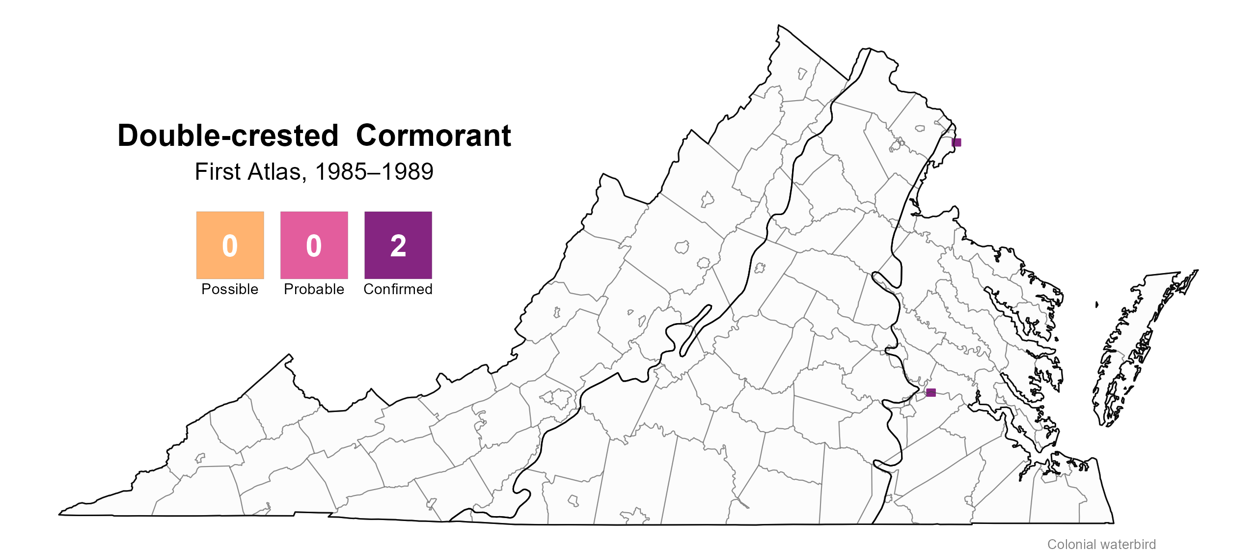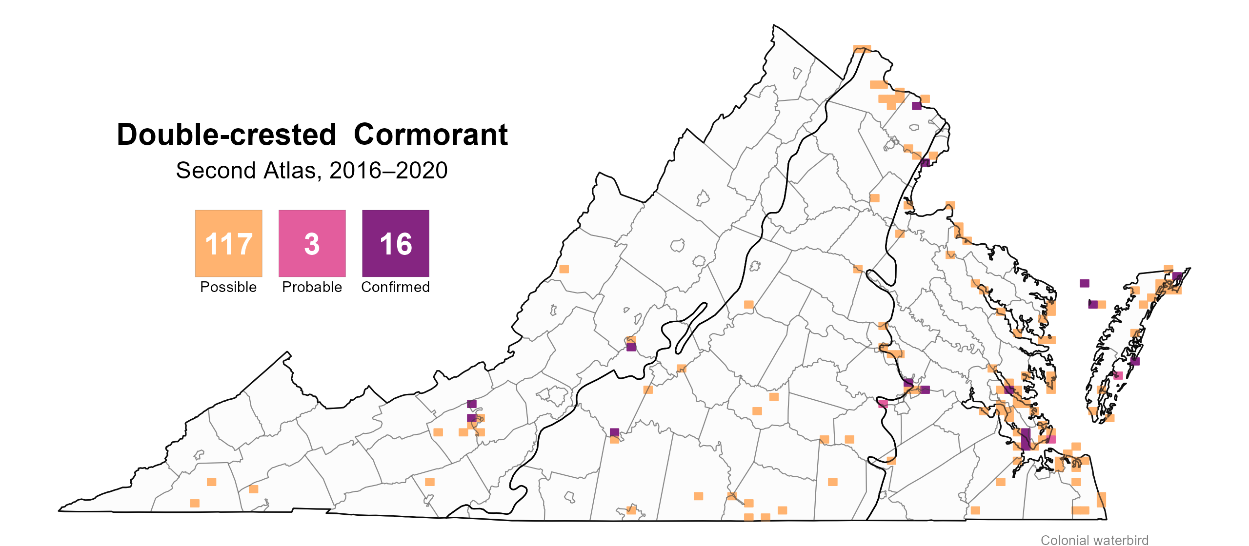 Given that the locations of nesting colonies were documented by the Virginia Colonial Waterbird Survey in 2018, Double-crested Cormorants in the Coastal Plain are unlikely to have nested in blocks without confirmed breeding evidence. There were additional breeding confirmations reported by Atlas volunteers in other years of the Second Atlas period. Outside of the Coastal Plain, where there is no systematic survey to identify nesting colonies, the nesting status of the species in blocks without confirmed breeding evidence is less clear.
