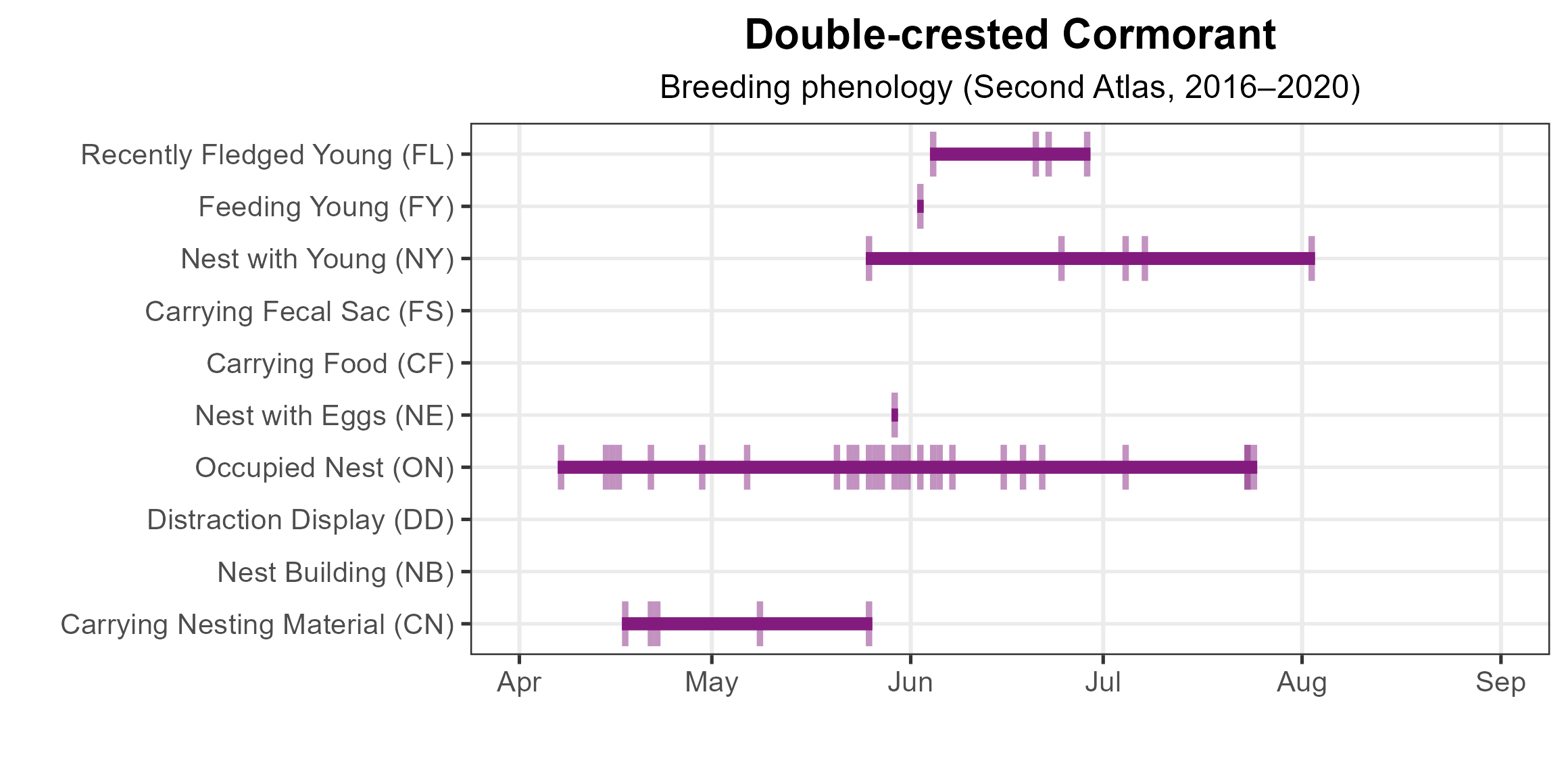 Figure 6: Double-crested Cormorant phenology: confirmed breeding codes. This graph shows a timeline of confirmed breeding behaviors. Tick marks represent individual observations of the behavior.