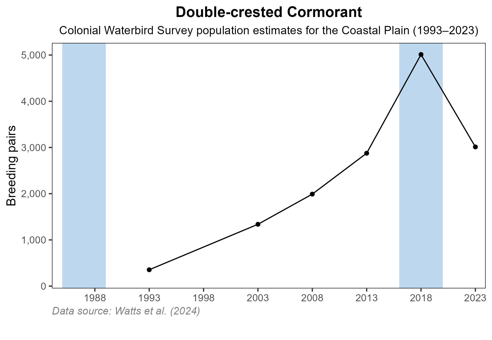 Figure 7: Double-crested Cormorant population trend for Virginia’s Coastal Plain. This chart illustrates the number of breeding pairs as estimated by the Virginia Colonial Waterbird Survey (Watts et al. 2024). A data point is not included for 1998, as the Survey covered a smaller geographic area in that year. The vertical light blue bars represent the periods corresponding to the First Atlas (1985–1989) and Second Atlas (2016–2020).
