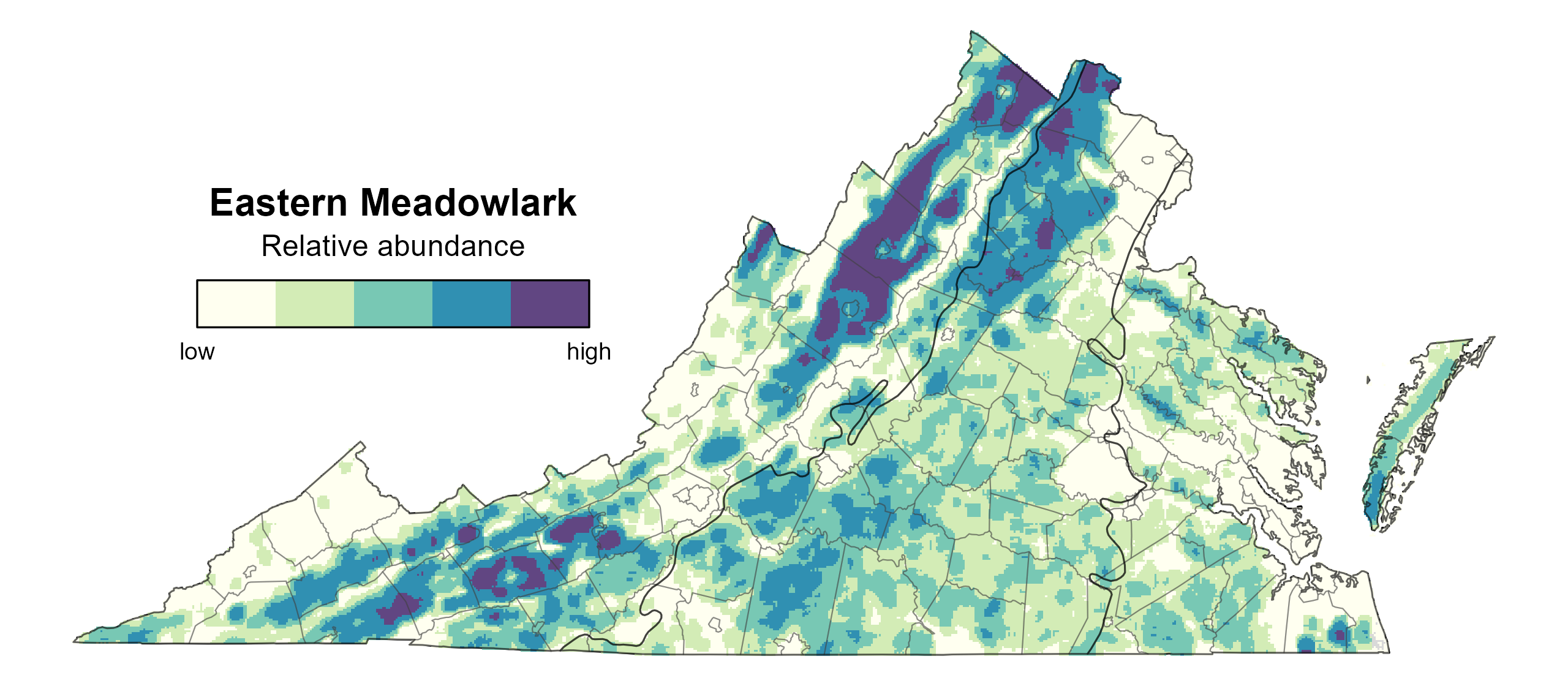 Eastern Meadowlark relative abundance was estimated to be highest in the agricultural areas of the Mountains and Valleys region, while their abundance was more variable in the Piedmont and Coastal Plain regions (Figure 7). In the Piedmont, abundance was generally higher closer to the Blue Ridge Mountains. Abundance was extremely low in developed areas in Hampton Roads-Virginia Beach, Northern Virginia, and Richmond.