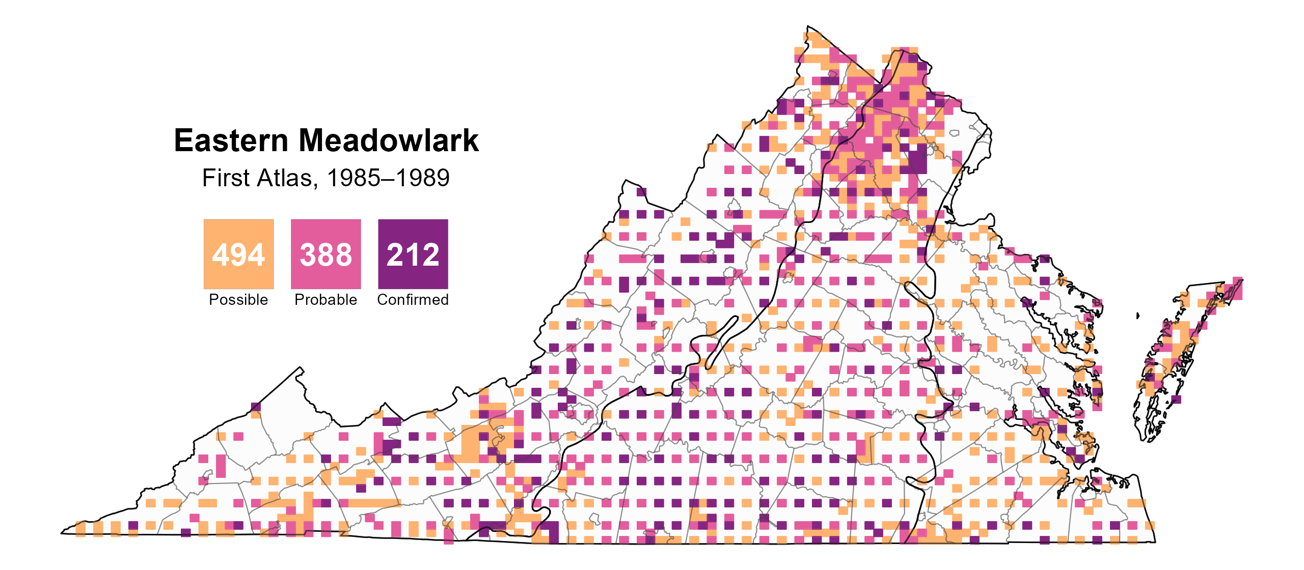 Eastern Meadowlarks are found in all regions of the state but are less likely to occur in the forested highlands of the Allegheny and Blue Ridge Mountains and in the urban areas of Northern Virginia and the I-64 corridor between Richmond and the Tidewater area (Figure 1).