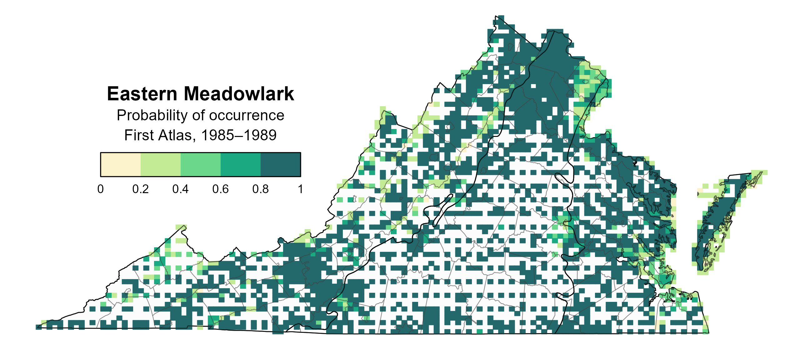 Figure 2: Eastern Meadowlark breeding distribution based on probability of occurrence (First Atlas, 1985–1989). This map indicates the probability that this species will occur in an Atlas block (an approximately 10 mi2 [26 km2] survey unit) based on environmental (including habitat) factors and after adjusting for the probability of detection (variation in survey effort among blocks). Blocks in white were not surveyed during the First Atlas and were not modeled.