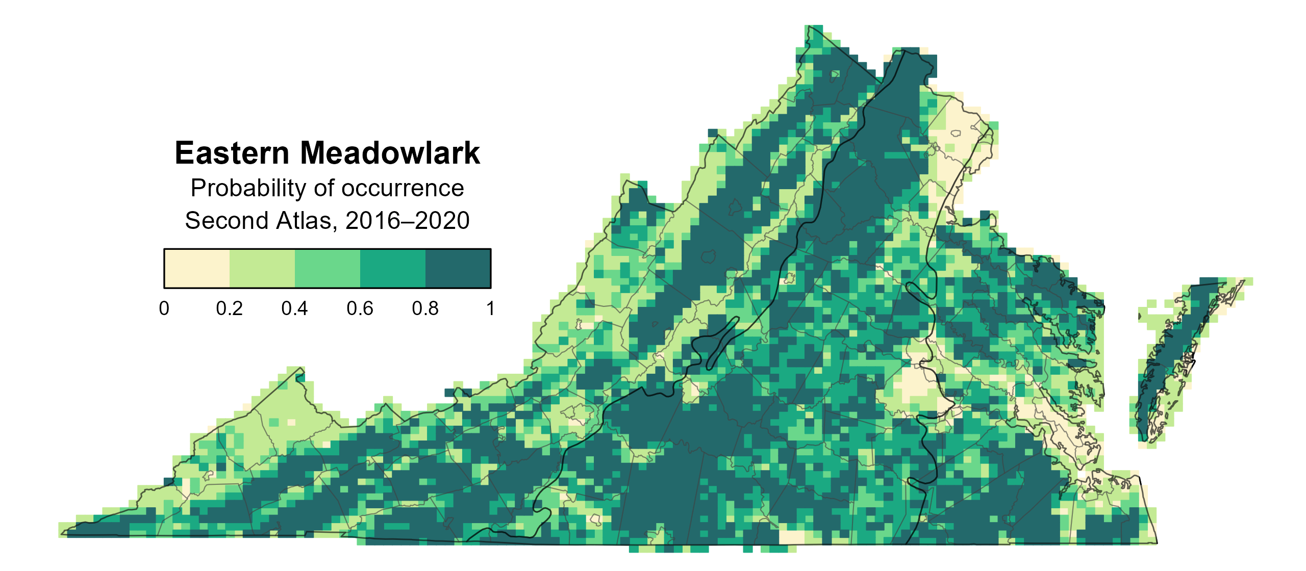 Figure 1: Eastern Meadowlark breeding distribution based on probability of occurrence (Second Atlas, 2016–2020). This map indicates the probability that this species will occur in an Atlas block (an approximately 10 mi2 [26 km2] survey unit) based on environmental (including habitat) factors and after adjusting for the probability of detection (variation in survey effort among blocks).
