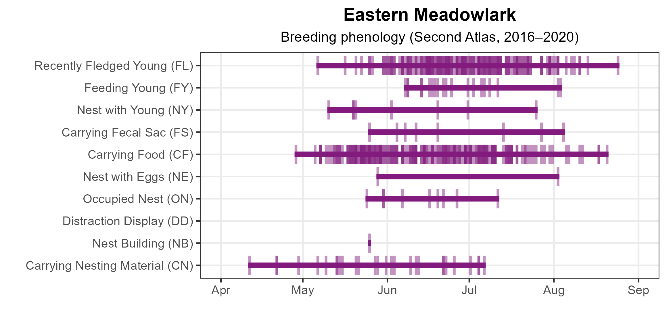 Figure 6: Eastern Meadowlark phenology: confirmed breeding codes. This graph shows a timeline of confirmed breeding behaviors. Tick marks represent individual observations of the behavior.