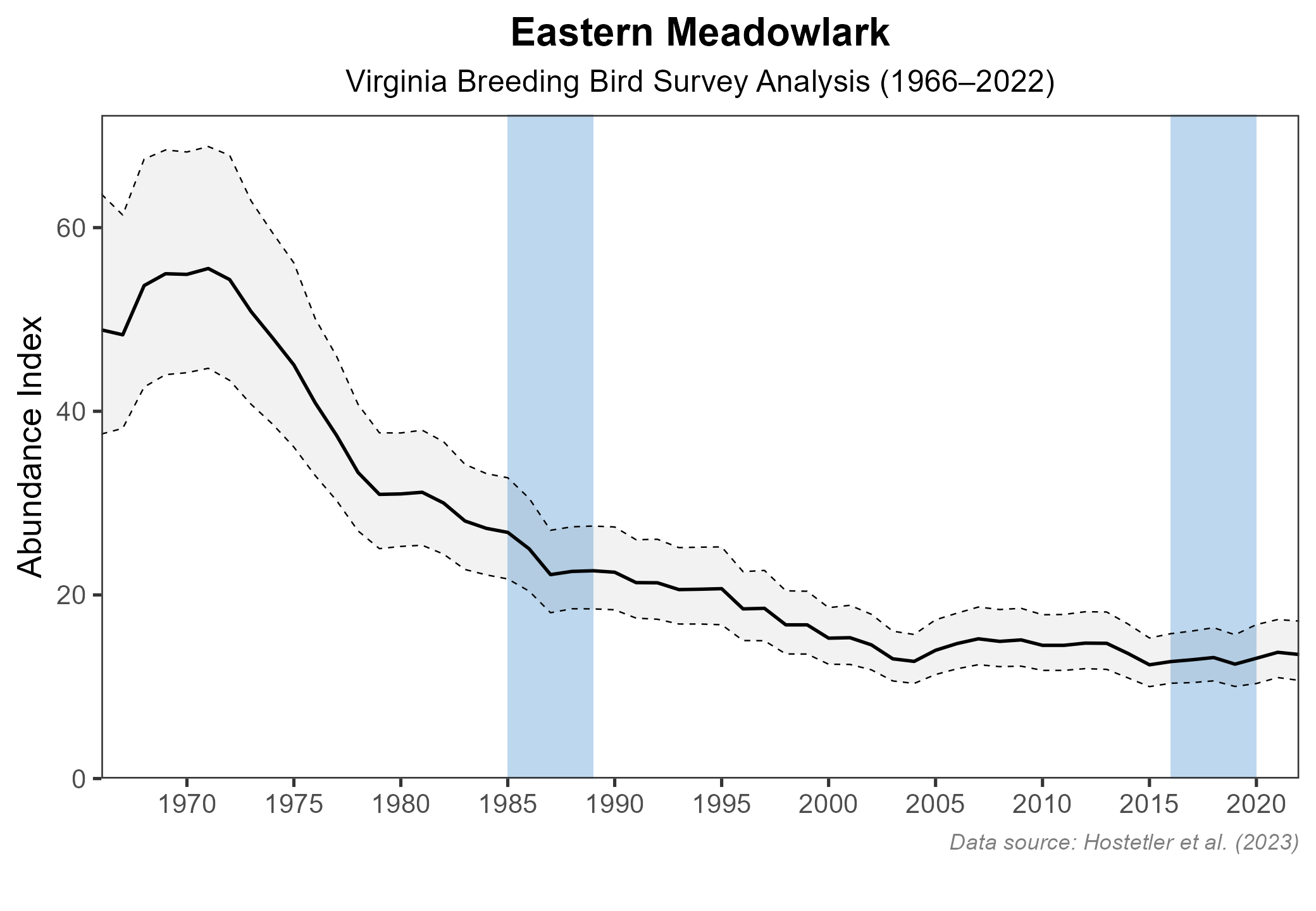 Figure 8: Eastern Meadowlark population trend for Virginia as estimated by the North American Breeding Bird Survey. The vertical axis shows species abundance; the horizontal axis shows the year. The solid line indicates the estimated population trend; there is a 97.5% probability that the true population trend falls between the dashed lines. The shaded bars indicate the First and Second Atlas periods.