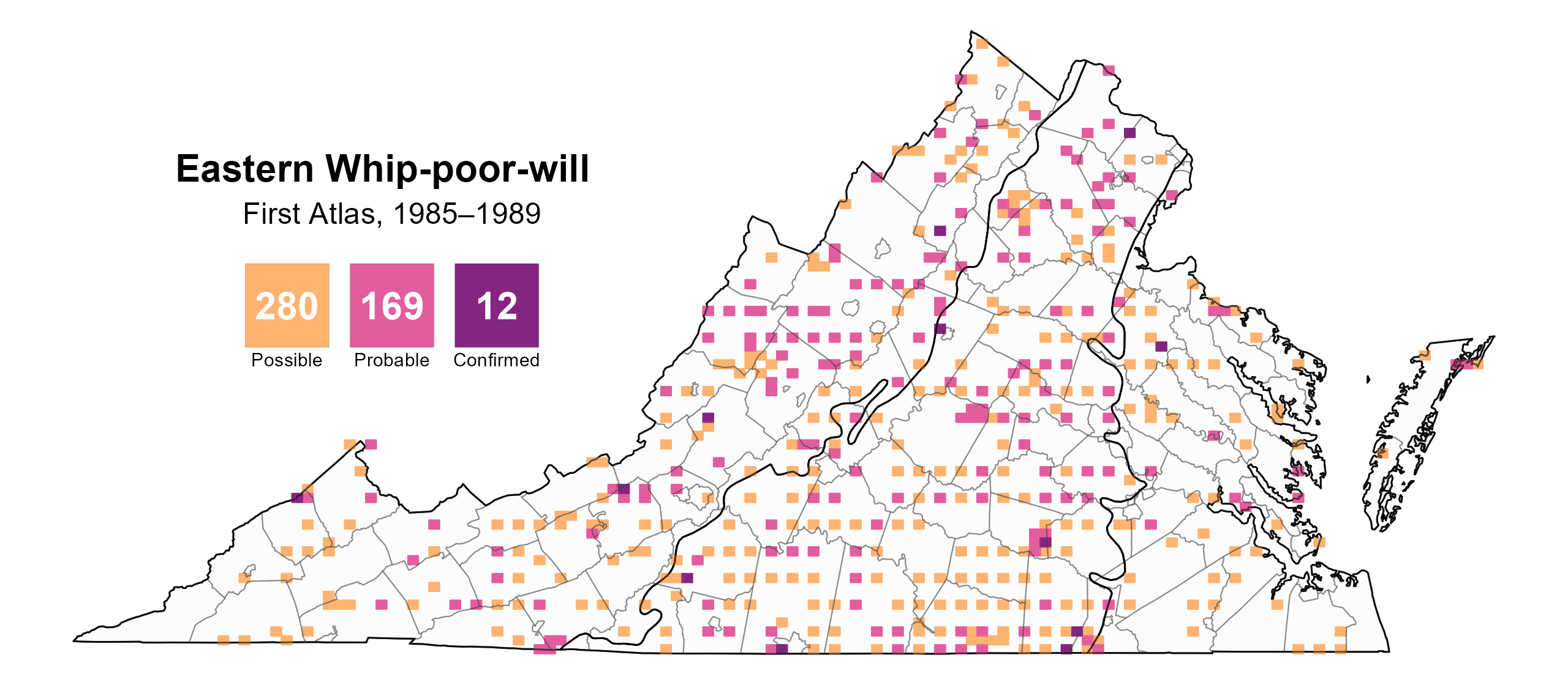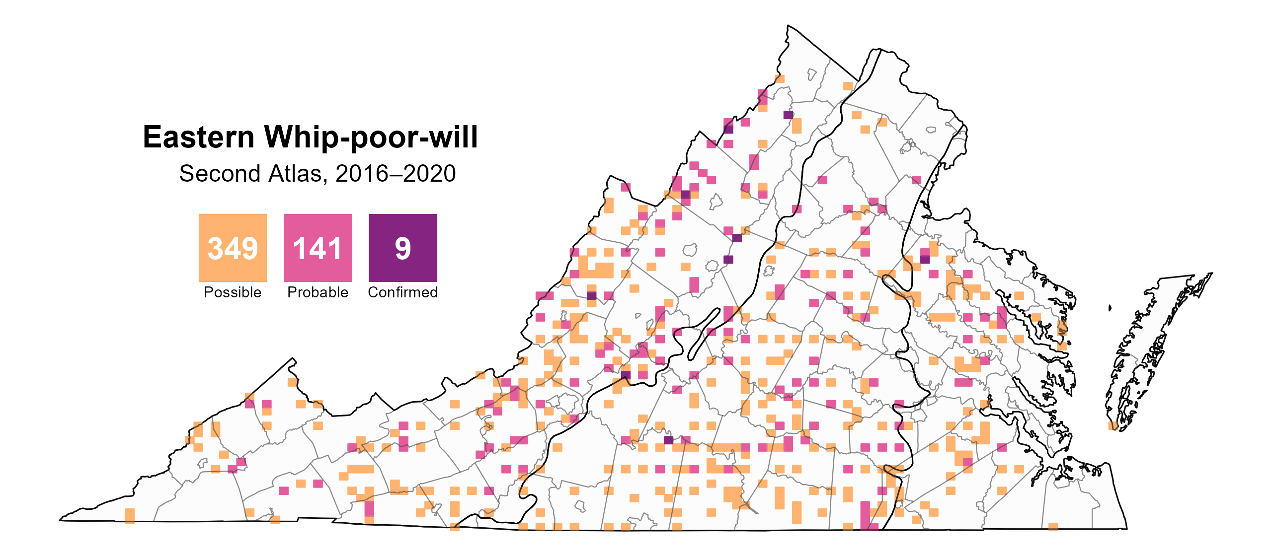 Eastern Whip-poor-wills were confirmed breeders in nine blocks and eight counties (Albemarle, Augusta, Bath, Bedford, Caroline, Pittsylvania, Rockingham, and Shenandoah) and found to be probable breeders in 51 additional counties (Figure 4). Breeding confirmations were few, due to the difficulty in observing Eastern Whip-poor-will breeding behavior at night and finding their highly camouflaged ground nests. The few observed nests were discovered when volunteers inadvertently flushed a bird that was on eggs or young. Blocks with detections were evenly distributed throughout the state, with only modest gaps occurring in extreme southwestern Virginia, the northern Piedmont, and the southeastern Coastal Plain. The number and distribution of blocks with breeding evidence were similar between Atlases (Figure 5).