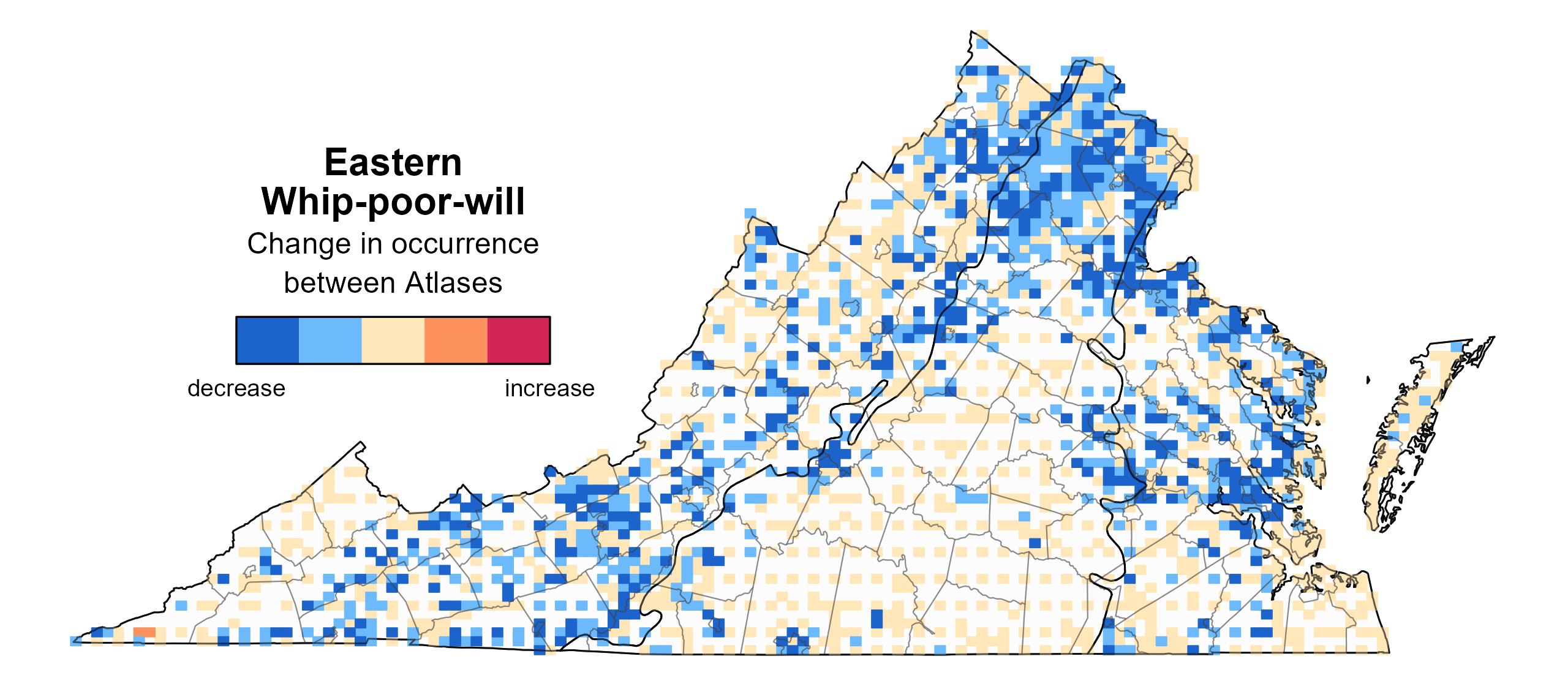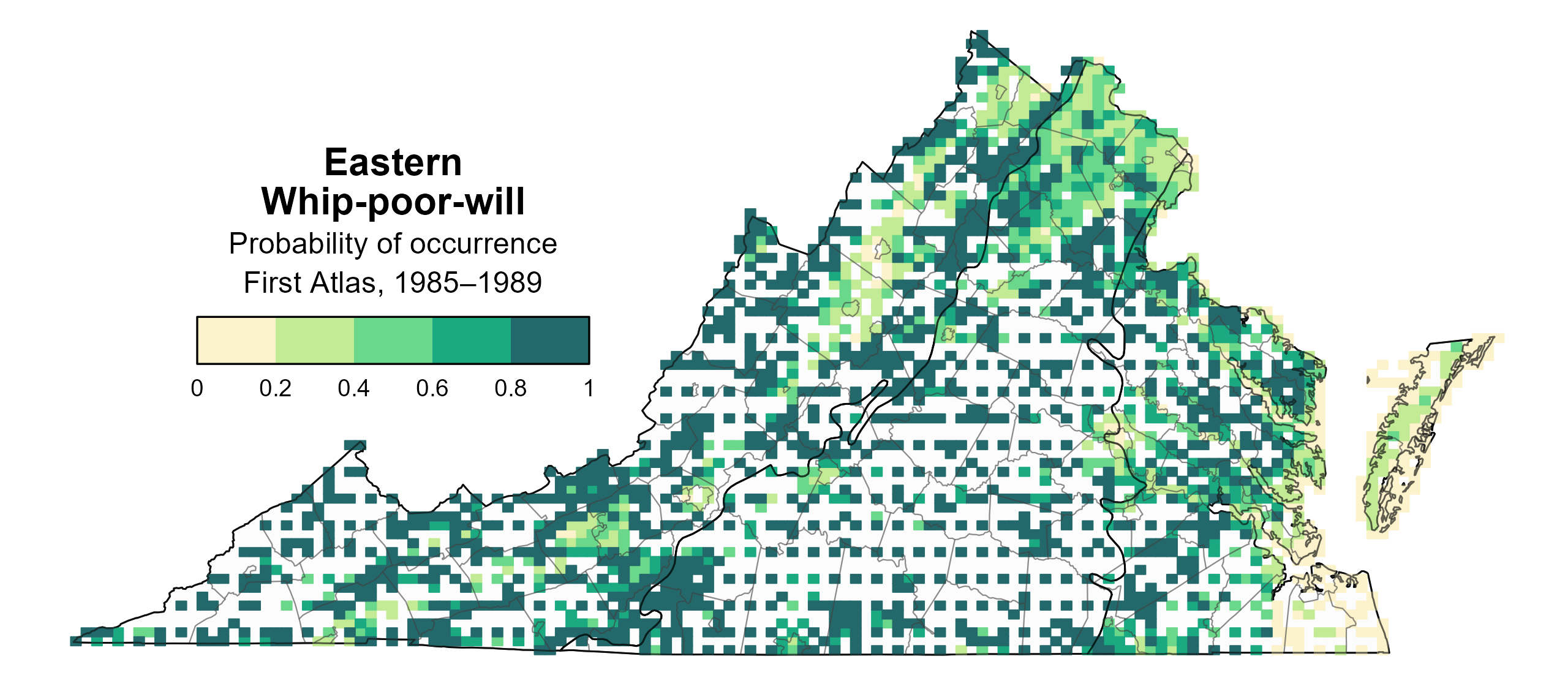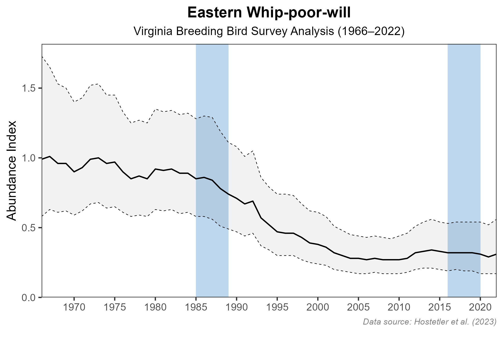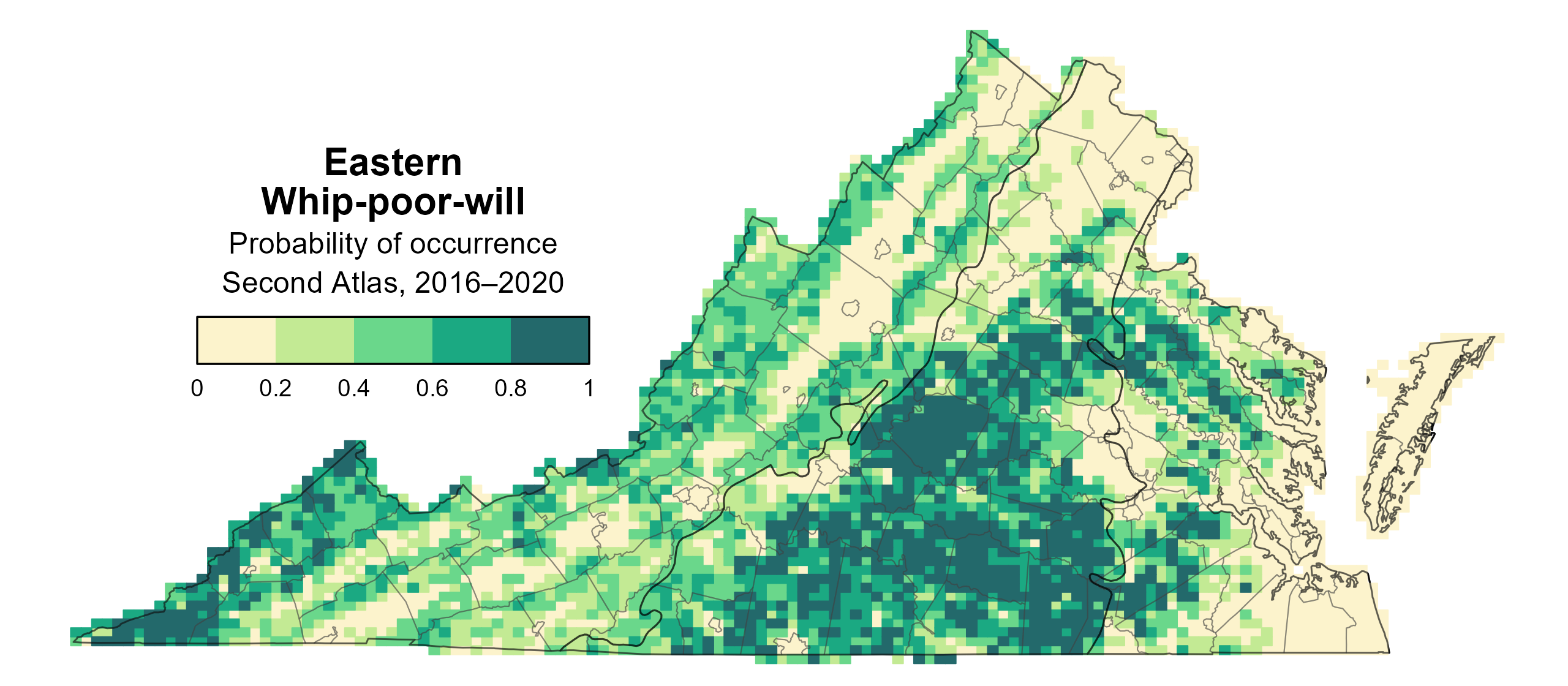 Insufficient detections during the Atlas point count surveys prevented the development of an abundance model for the Eastern Whip-poor-will. The North American Breeding Bird Survey (BBS) trend for Virginia estimated a significant decrease of 2.05% per year from 1966–2022 (Hostetler et al. 2023; Figure 6). Between the First and Second Atlas, BBS data showed a slightly stronger significant decrease of 3.08% per year from 1987–2018.