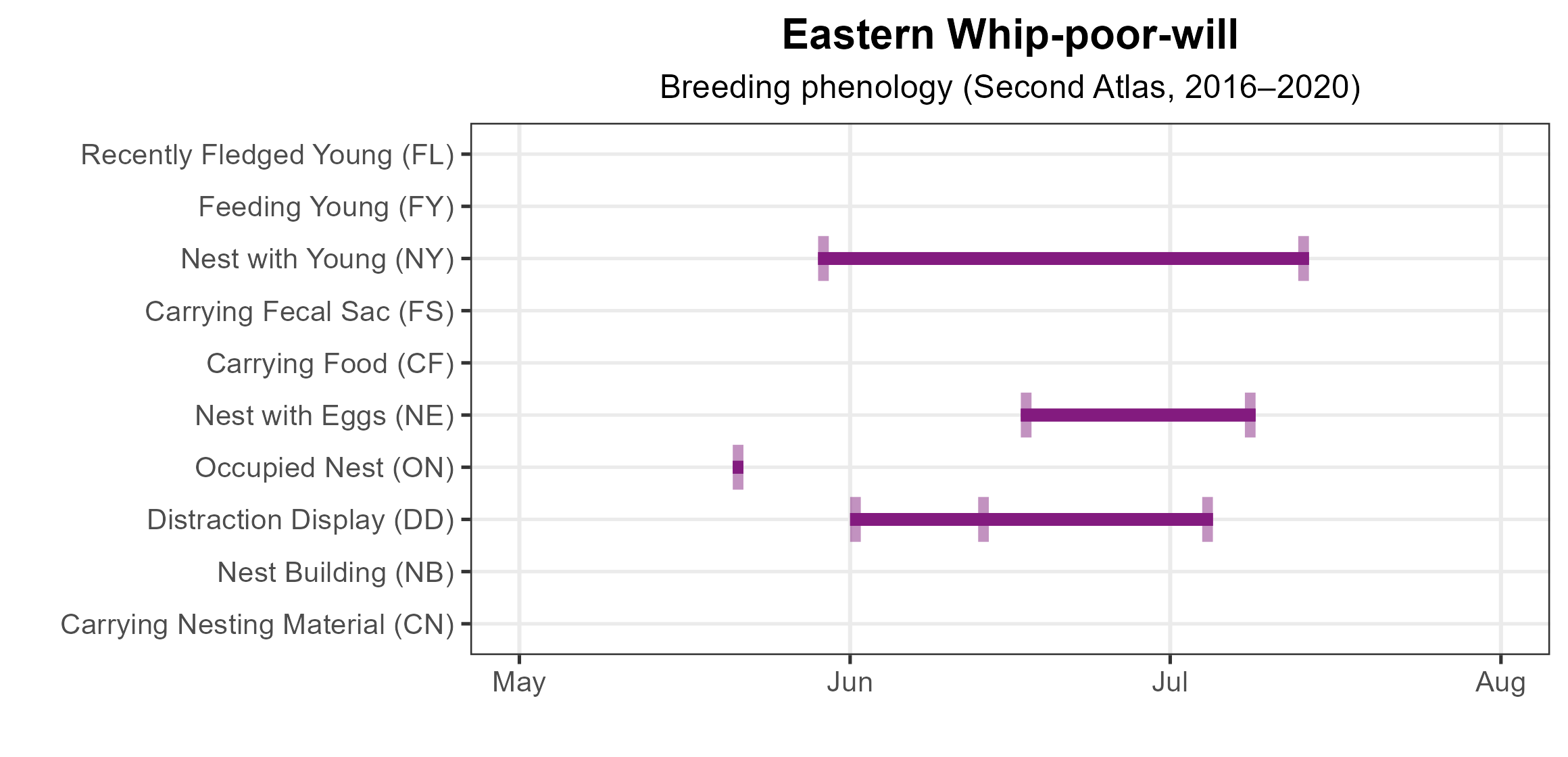 Figure 6: Eastern Whip-poor-will phenology: confirmed breeding codes. This graph shows a timeline of confirmed breeding behaviors. Tick marks represent individual observations of the behavior.