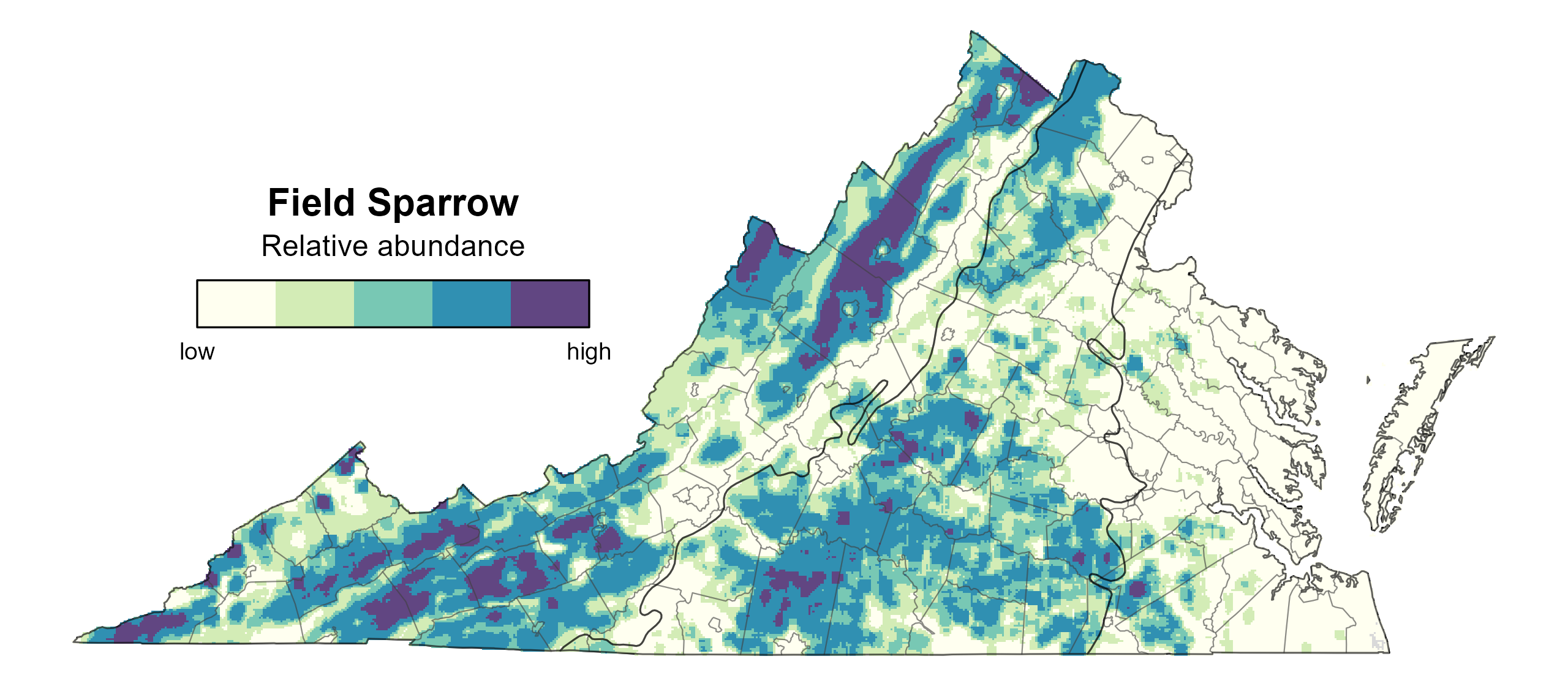 Field Sparrow relative abundance was estimated to be highest in the agricultural mountain valleys and throughout the Piedmont region where agricultural, grassland, and shrubland habitats exist on the landscape (Figure 7). Throughout the remainder of the state, their abundances levels were predicted to be moderate to low.