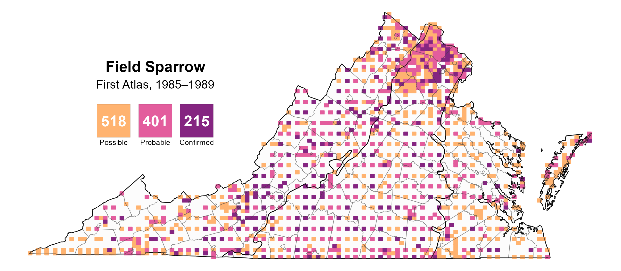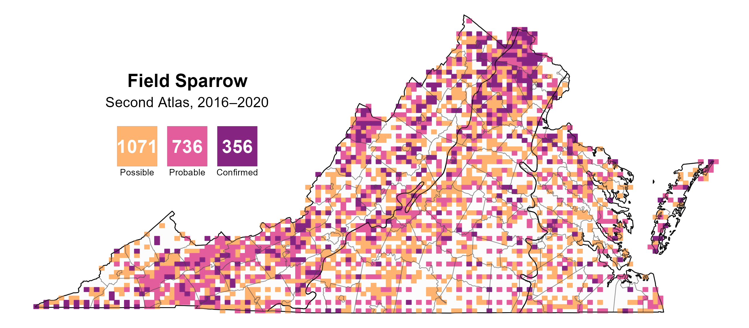 The Field Sparrow is a widely distributed North American sparrow commonly found in old fields and scrubby secondary growth. Its washed-out gray-and-rusty plumage, along with its bright pink bill and legs, make it stand out from other sparrows. More notable than its appearance, however, is its song, an accelerating bouncing-ball trill. In Virginia, Field Sparrows inhabit diverse environments, from vacant lots to reclaimed mined lands. As partial migrants, some winter birds migrate from northern ranges, while some summer breeders depart in winter (Carey et al. 2020). Other individuals are permanent residents. Their long-term population trends in the state (see Population Status) highlight the consequences of habitat change on shrubland birds.