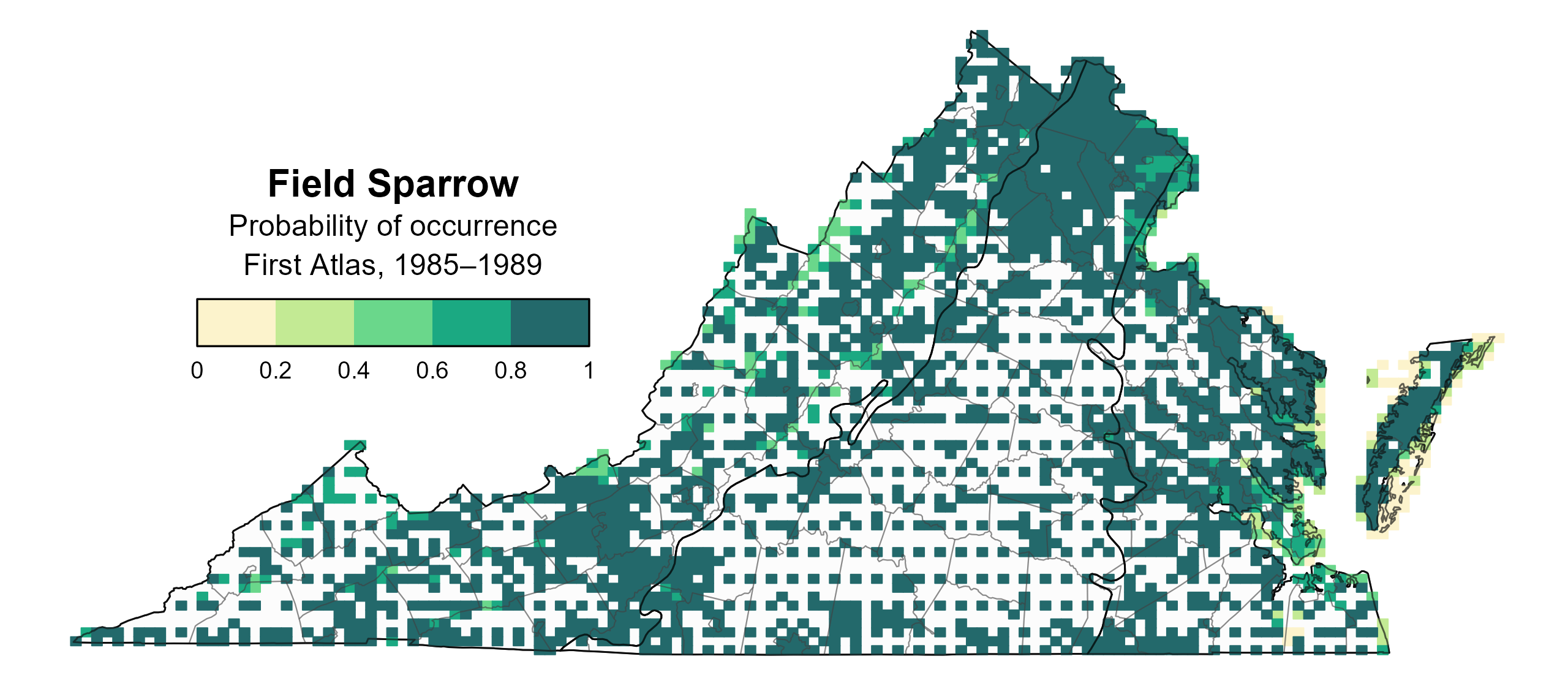 Field Sparrows are found in all regions of the state in most non-forested areas outside urban centers (Figure 1). More specifically, they are most likely to occur in the central portion of the Mountains and Valleys region and in the Piedmont region, except around the highly developed areas of Richmond and Northern Virginia. They are slightly less likely in the Coastal Plain and parts of the Eastern Shore; however, even in these areas, they are moderately likely to occur, indicating that a large scrubby field could easily host the species. The likelihood of a Field Sparrow occurring in a block increases sharply with the proportion of agricultural land (which includes hay fields and pastures). They are also more likely to occur in blocks with more shrubland and forest cover; while they do not nest in forest, they commonly use forest edges. Occurrence is less likely in blocks with a greater diversity of habitat types.