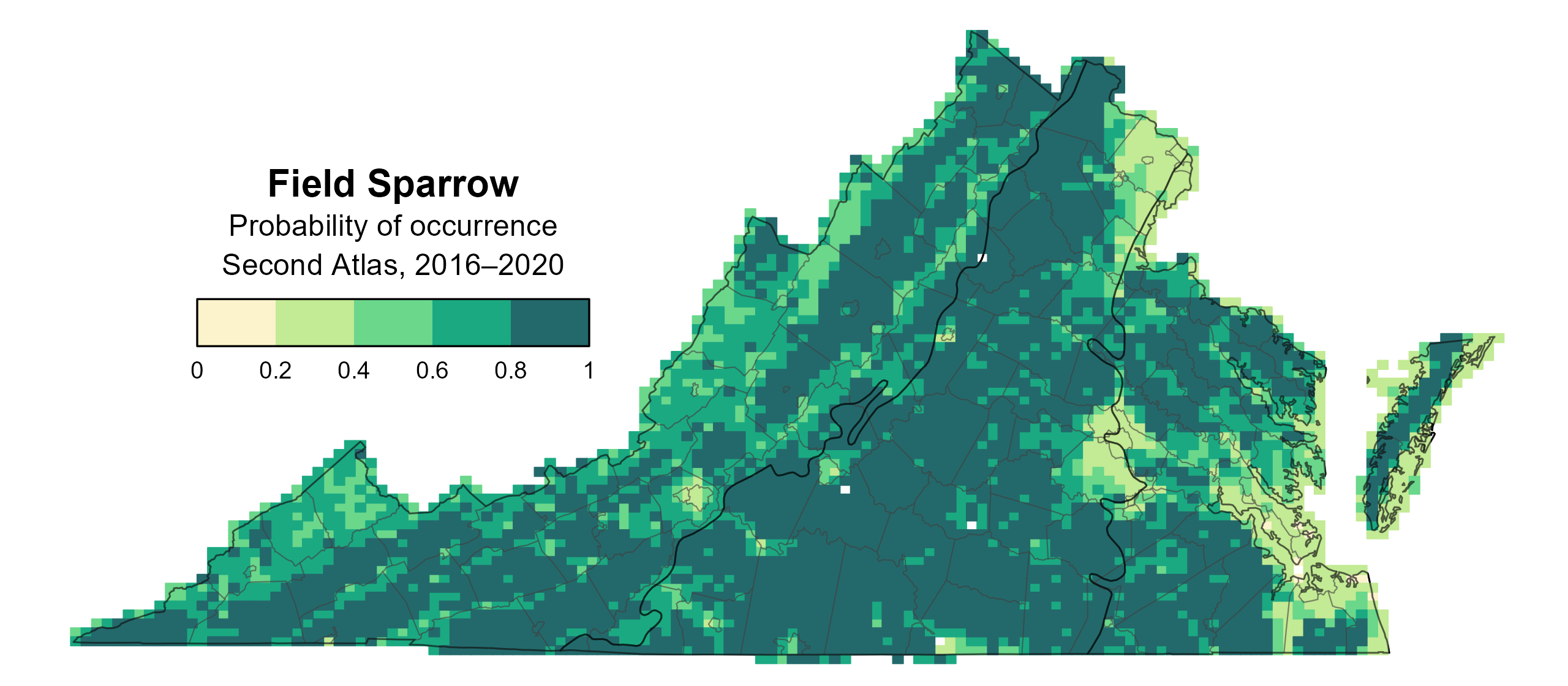 Figure 1: Field Sparrow breeding distribution based on probability of occurrence (Second Atlas, 2016–2020). This map indicates the probability that this species will occur in an Atlas block (an approximately 10 mi2 [26 km2] survey unit) based on environmental (including habitat) factors and after adjusting for the probability of detection (variation in survey effort among blocks).