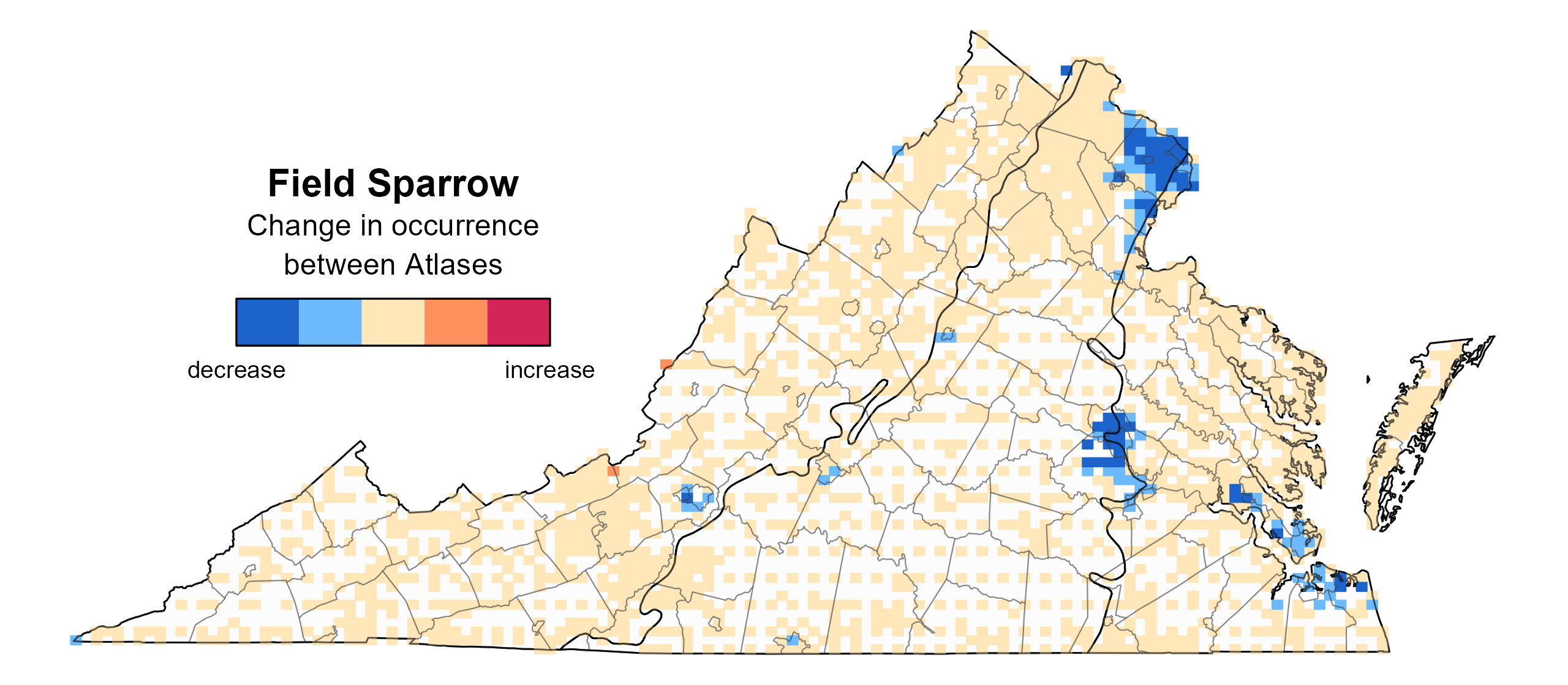 Field Sparrow occurrence in the Second Atlas was largely similar to that in the First Atlas (Figure 2). However, the Field Sparrow’s occurrence decreased in urbanized areas, especially in Hampton Roads, Richmond, and Northern Virginia (Figure 3). These areas have experienced an increase in urban cover since the First Atlas. Because Field Sparrows will not nest close to human structures (Carey et al. 2020), the replacement of agricultural (hay and pasture) and shrubland habitat with expanding urban and suburban areas has reduced the availability of suitable Field Sparrow habitat. Its probability of occurrence remained otherwise constant across most of the state. Notably, trends in abundance reflect a steady, widespread decline in numbers that may not be reflected in their overall presence versus absence (see Population Status).