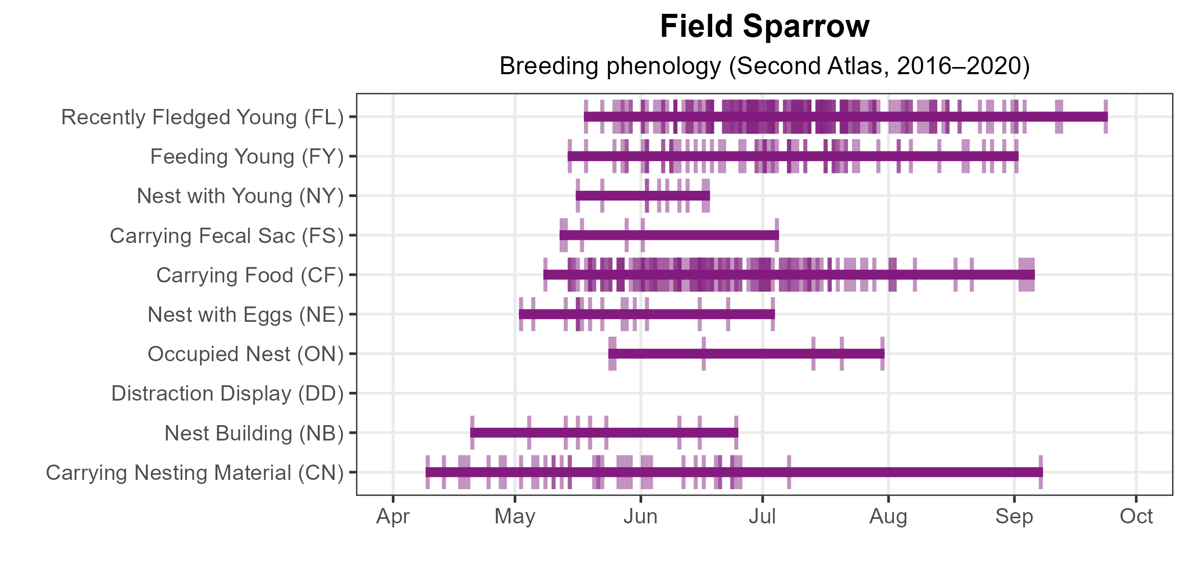 Figure 6: Field Sparrow phenology: confirmed breeding codes. This graph shows a timeline of confirmed breeding behaviors. Tick marks represent individual observations of the behavior.